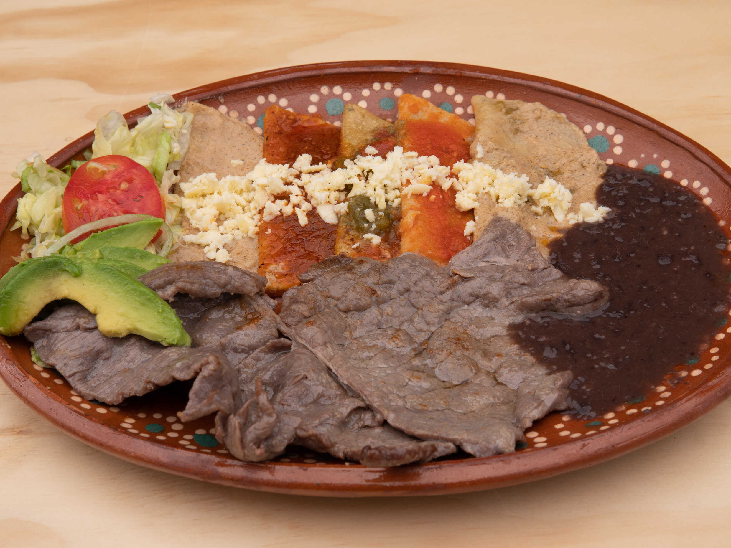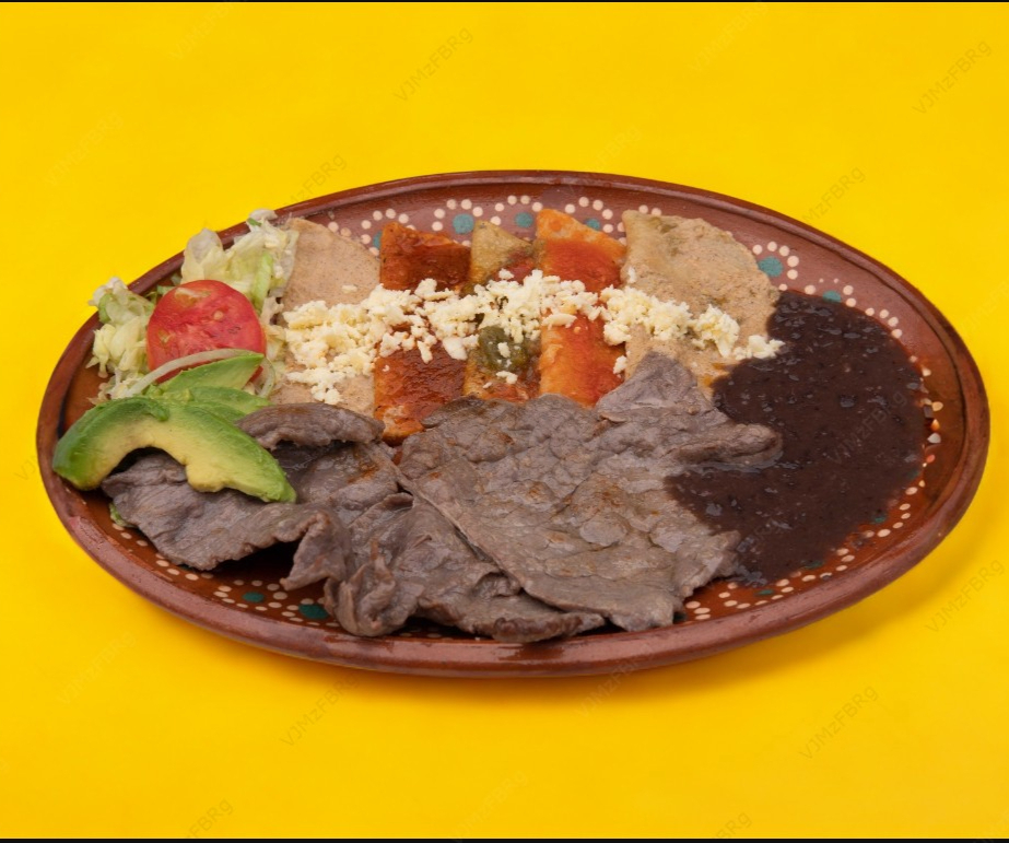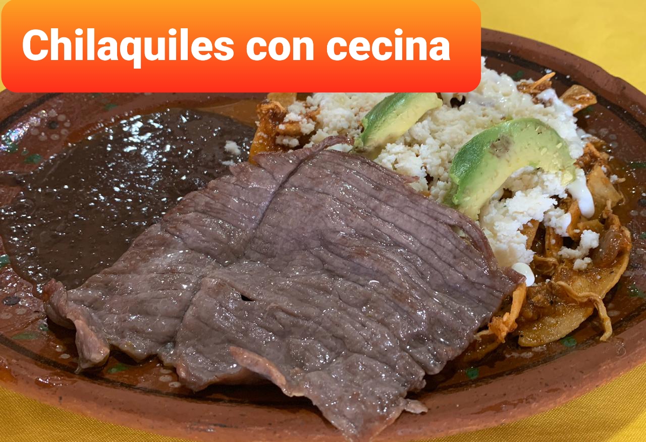 Naturales acompañados con cecina, bañados en la salsa de tu elección Poco Picosa ó No Picosa ó Muy Picosa, decorados con crema, queso, rodajas de jitomate, cebolla y aguacate, acompañados de frijoles y bolillo.