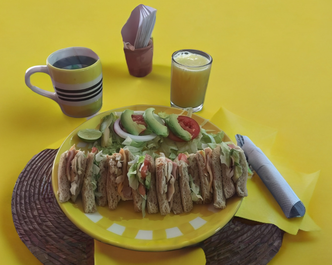 Pan integral o pan blanco, jamón, queso amarillo, pollo, lechuga, rebanada de jitomate, cebolla y aguacate. Acompañado de papas a la francesa, cátsup y chiles envinagres.