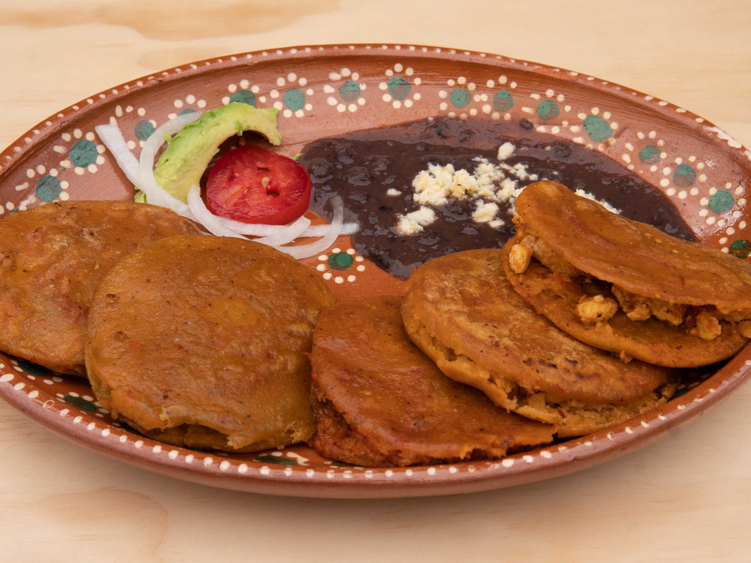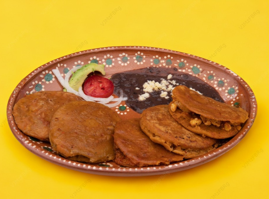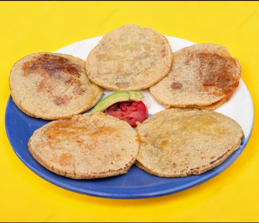 5pzas. Puedes escoger rellenos: de chorizo o huevo verde o huevo rojo o deshebrada o chicharrón o queso o frijoles, acompañados de frijoles.