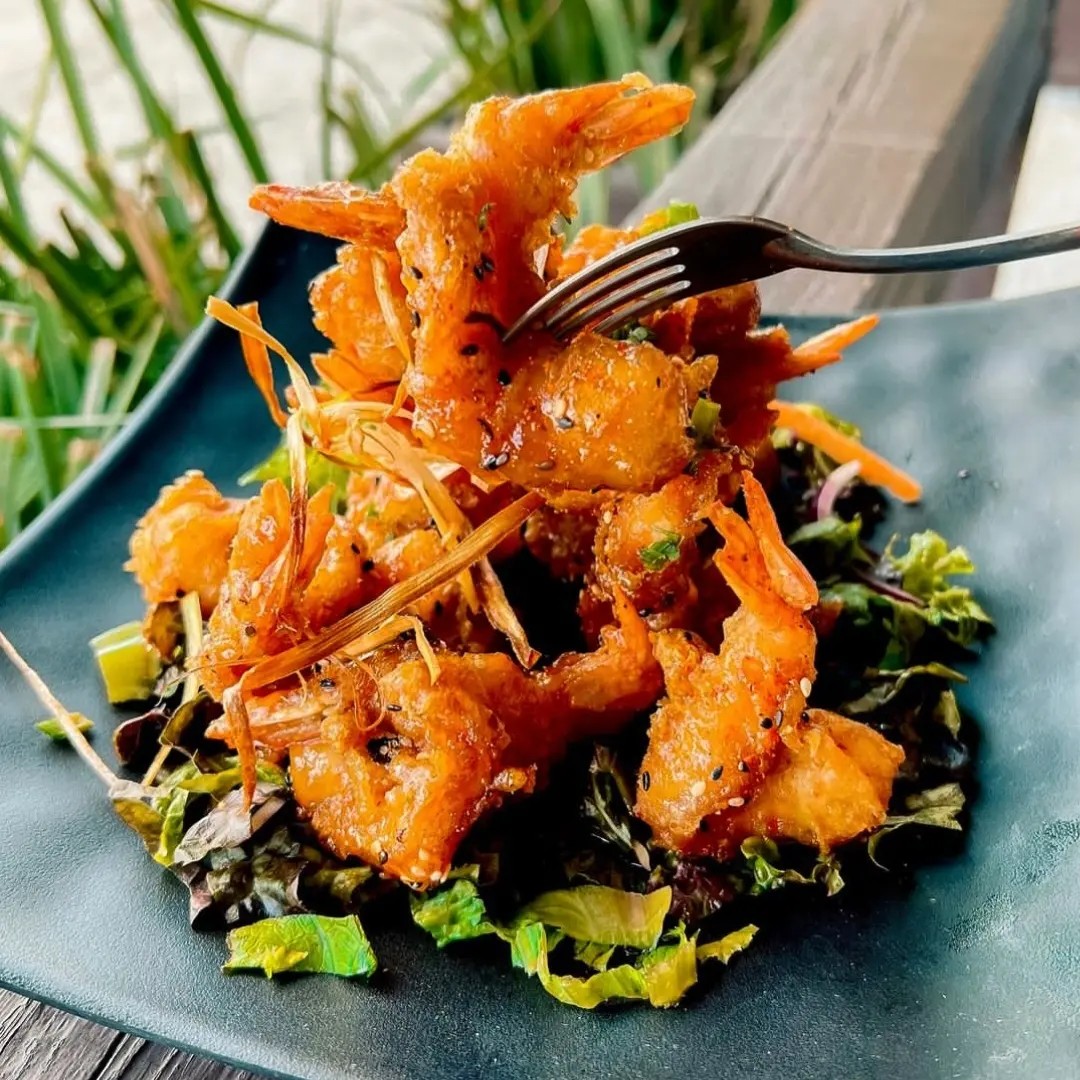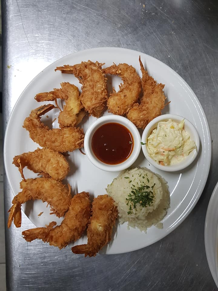 Camarones empanizados en coco, acompañados con salsa agridulce.