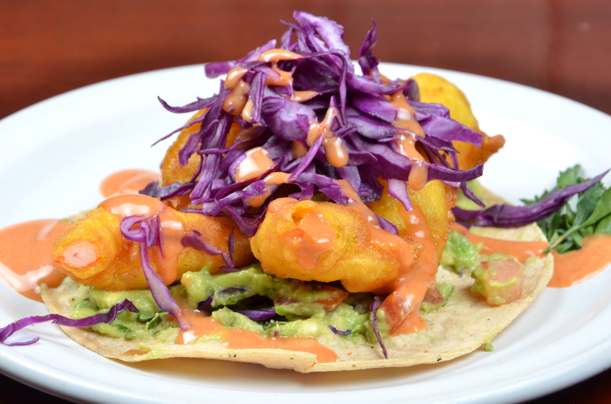 Taco de camarón empanizado en tortilla dorada estilo gold.