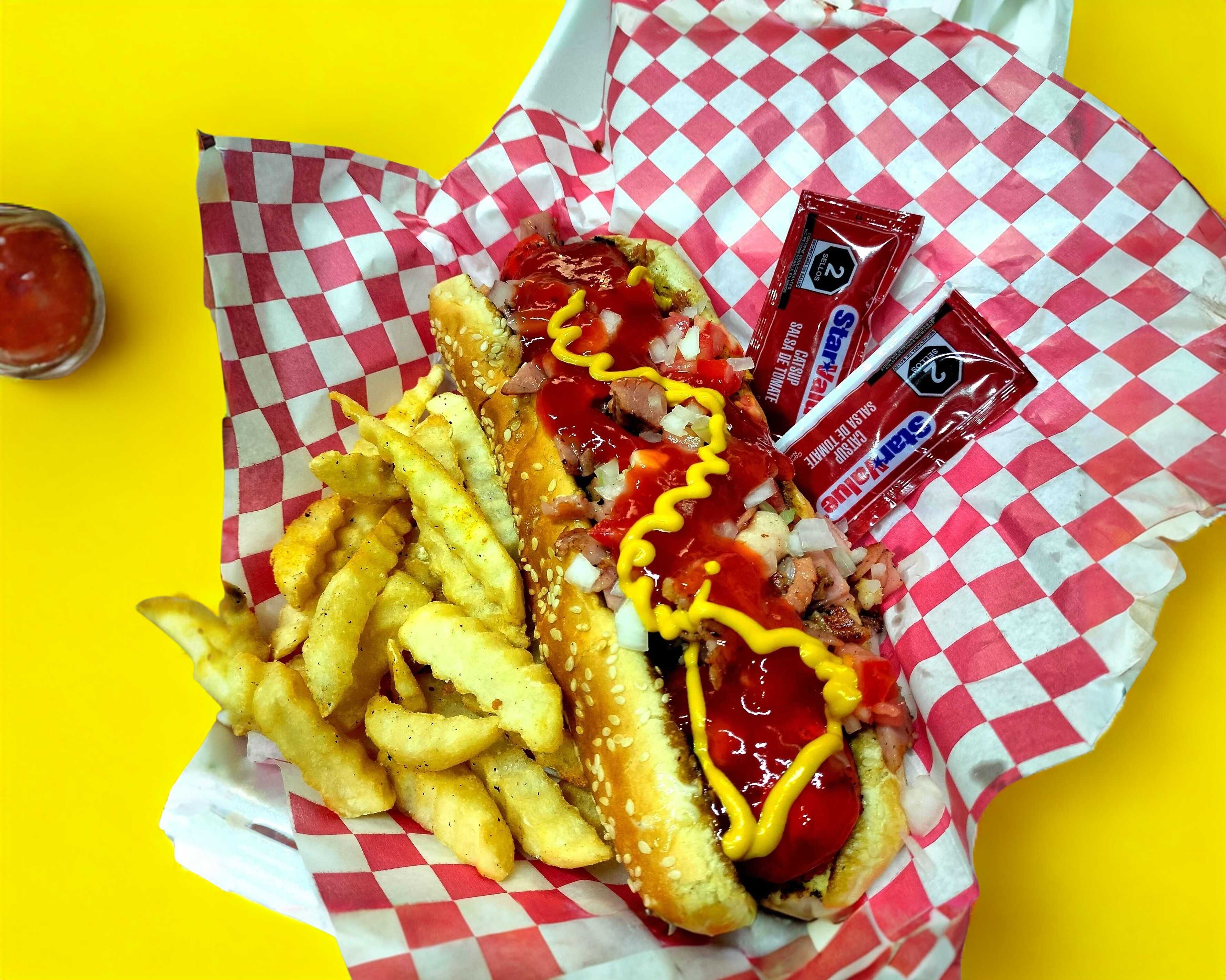 Mega hot dog acompañado de tocino y papas a la francesa.