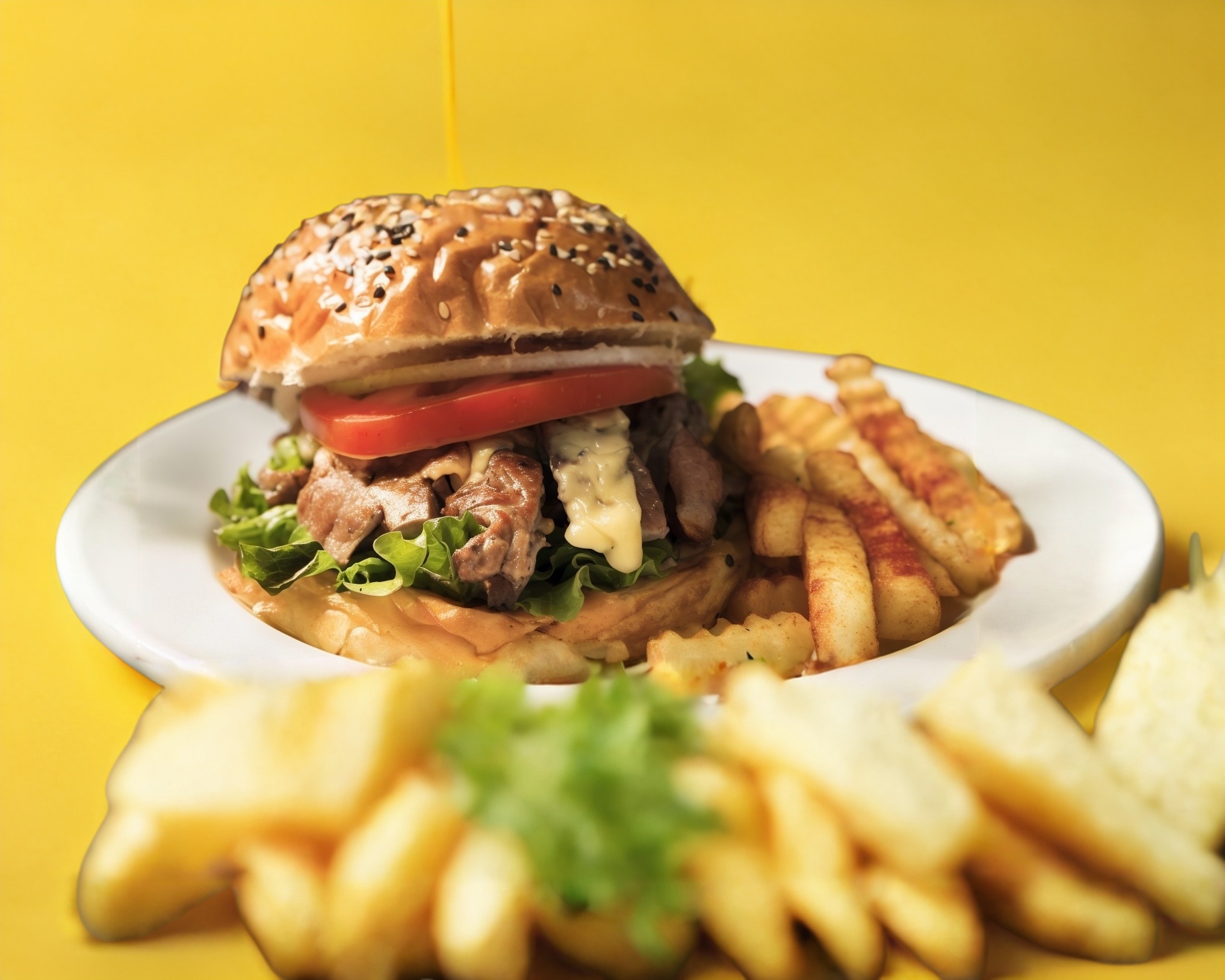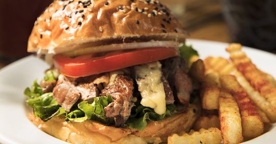 Hamburguesa de trozos de arrachera con verdura, tocino, jamón, queso amarillo y queso blanco acompañada de papas a la francesa