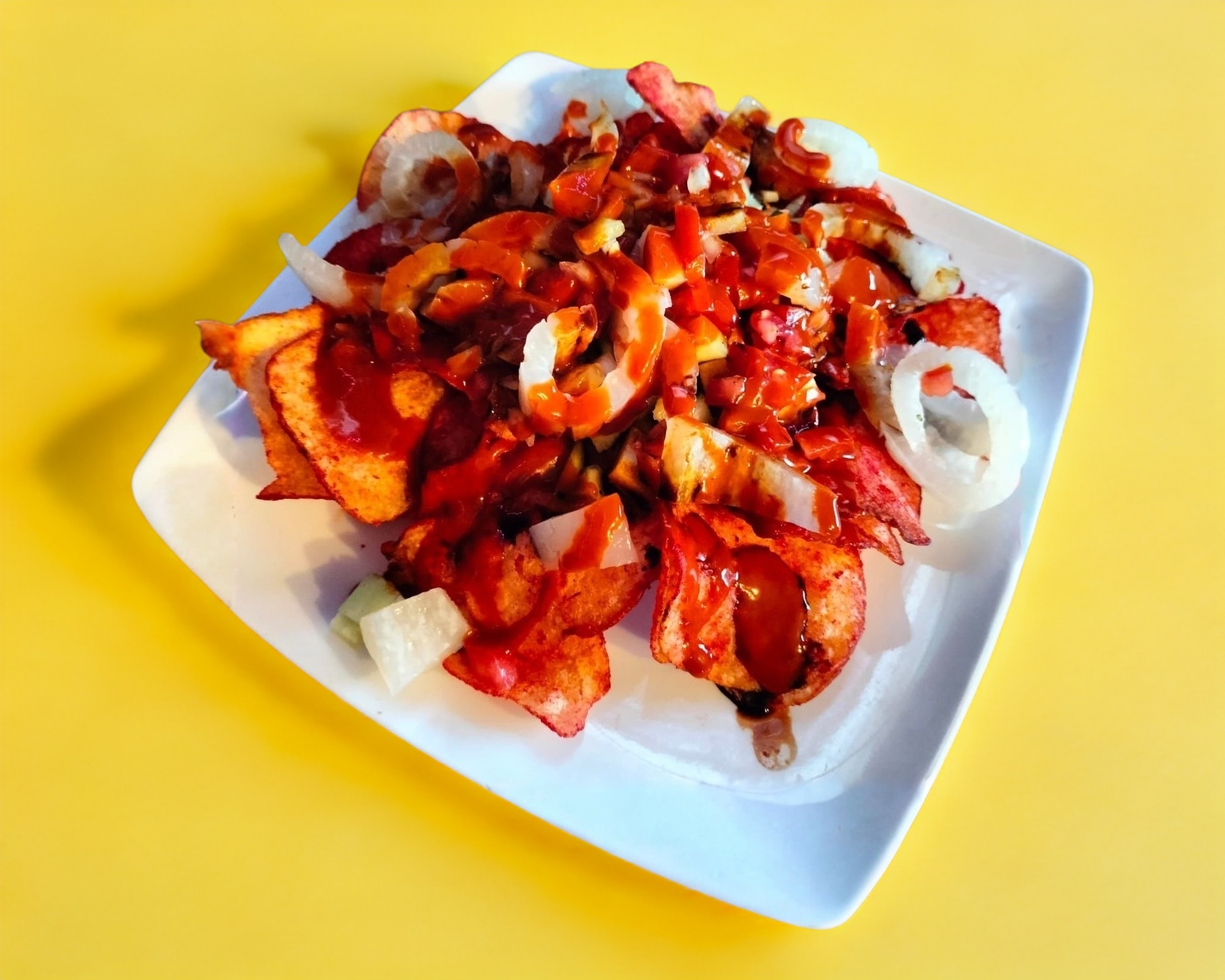 Totopos, frijoles, queso amarillo, cueritos, pico de gallo y jalapeños.