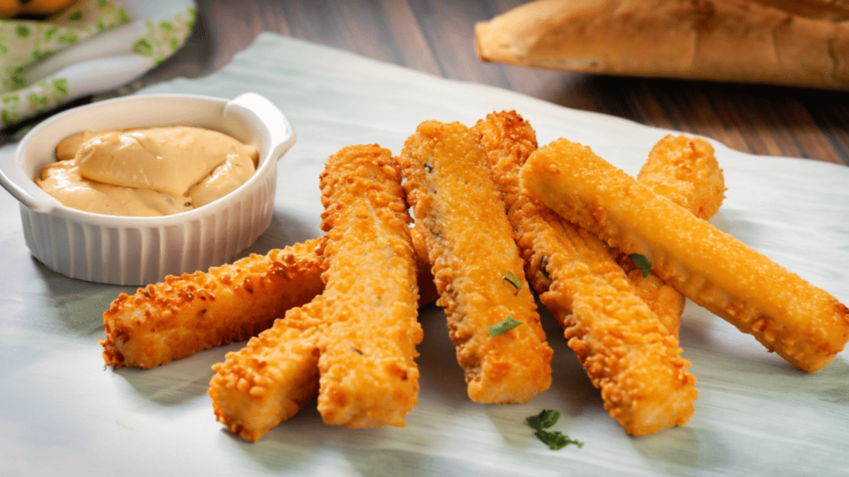 Palitos de queso mozzarella empanizados acompañados de aderezo ranch