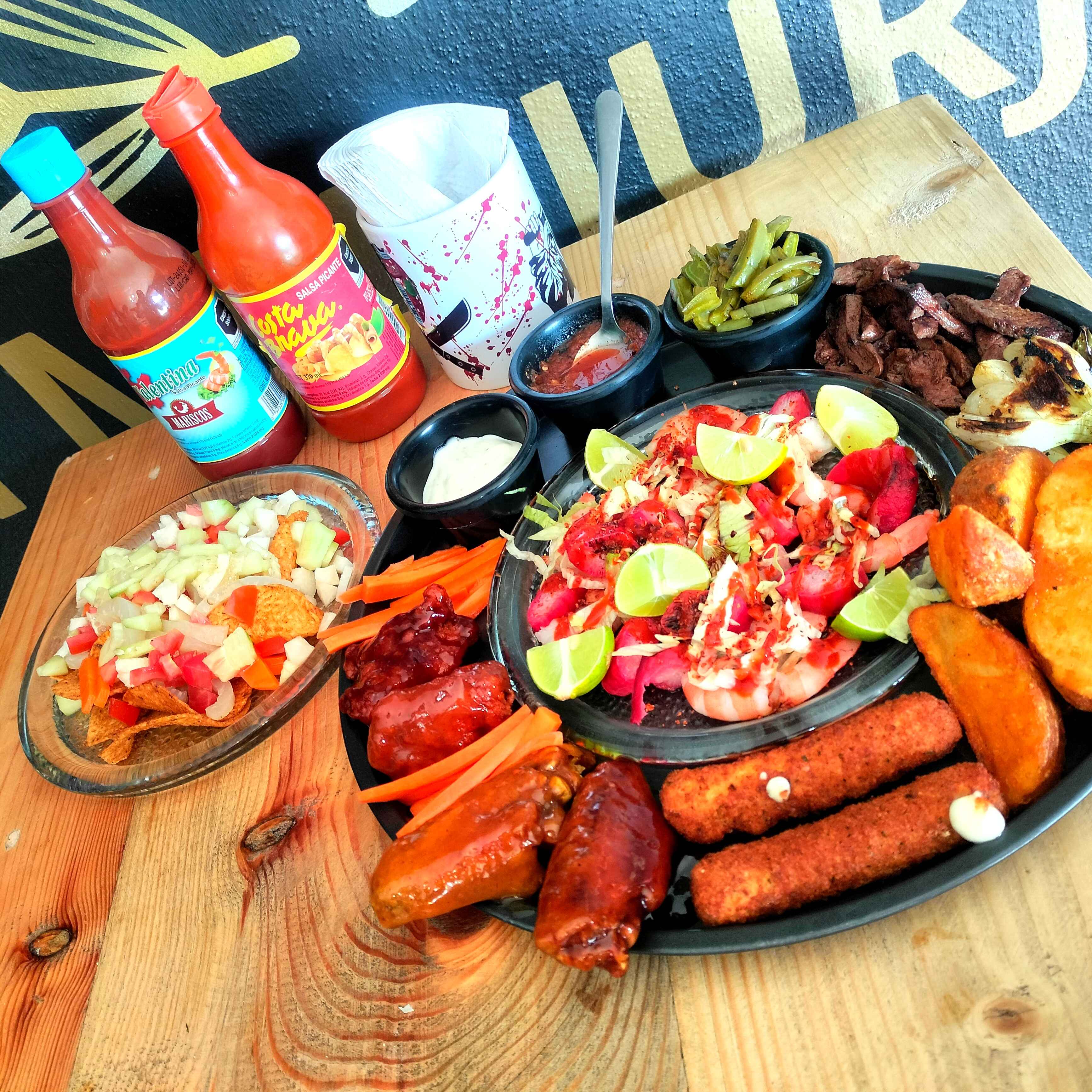 Prueba de todo un poco con nuestro sampler que lleva dedos de queso, papas francesas, gajos, ceviche, arrachera y alitas bbq