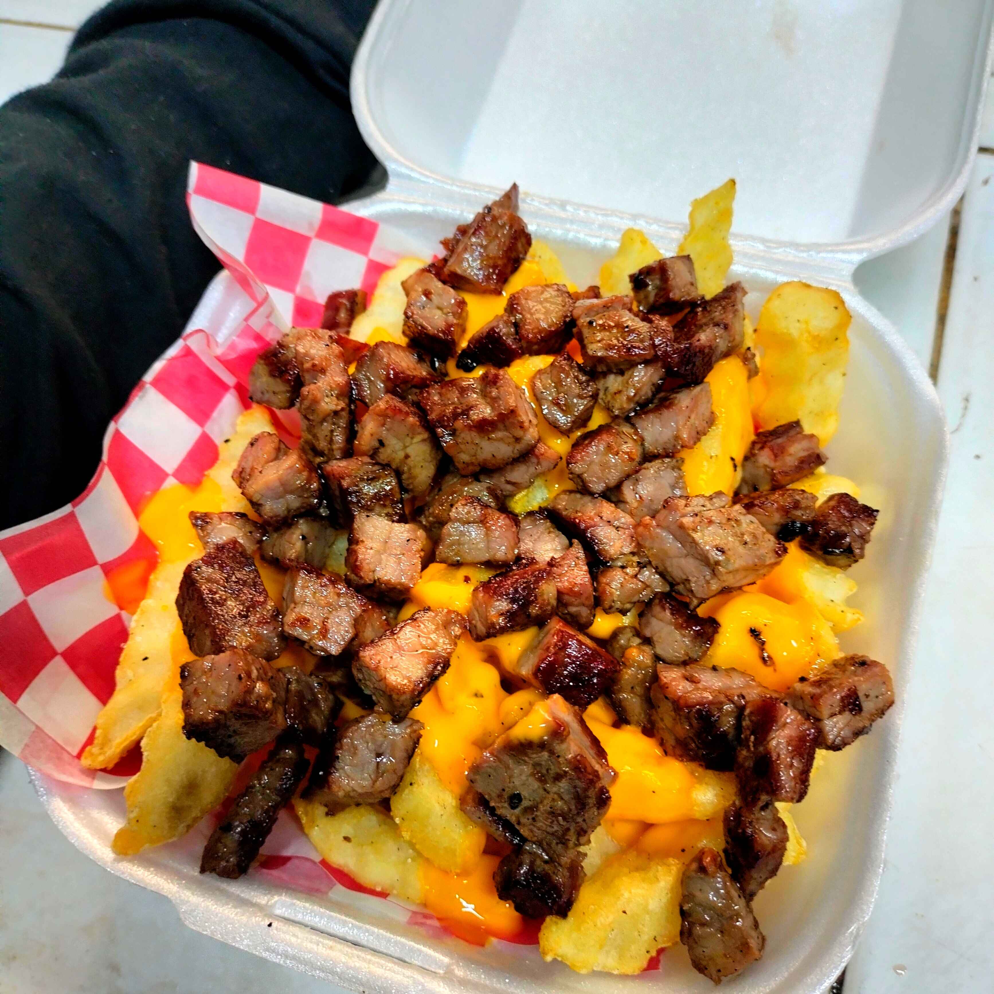 Papas a la francesa con queso por encima y trocitos de arrachera