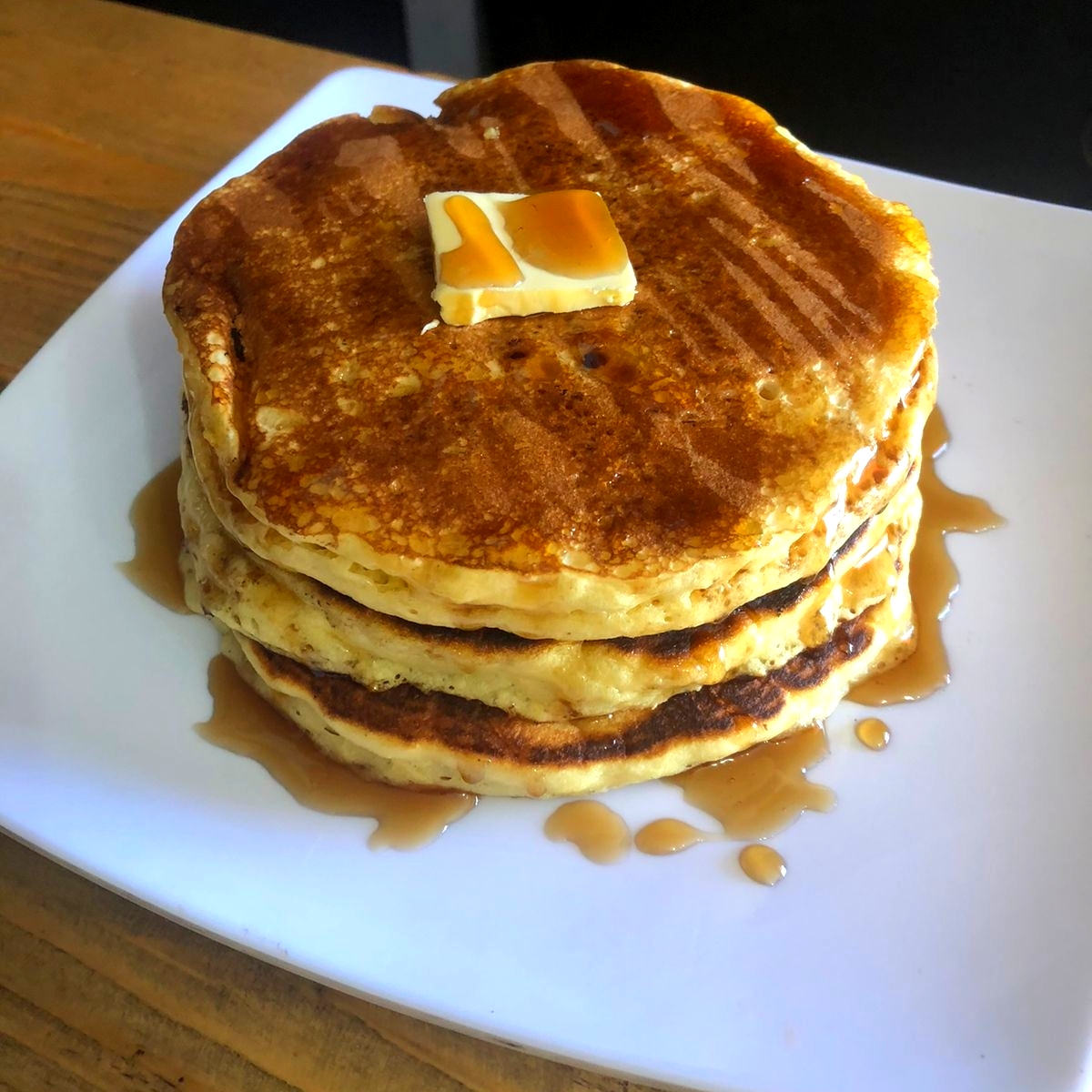 Orden de 3 Hot Cakes acompañados de platano, miel, y lechera.