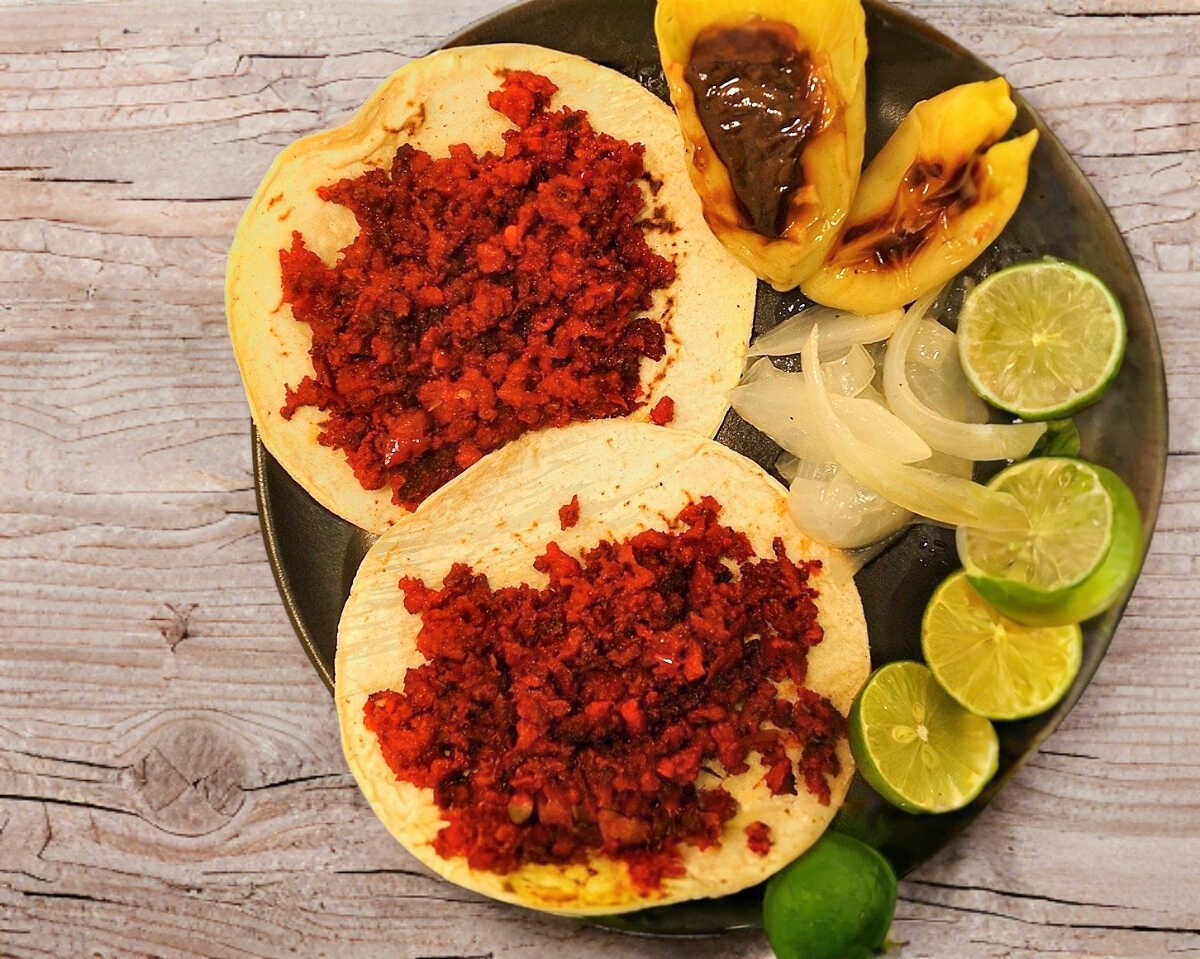 Doble tortilla de maíz con carne, incluye salsas y verduras.