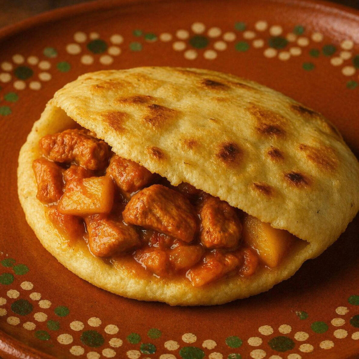 Una Gordita gruesa de maíz y manteca de cerdo que puede ir rellena de queso, frijoles negros, huevo, chorizo, huevo con chorizo, huevo verde, huevo rojo o frijoles con queso.
