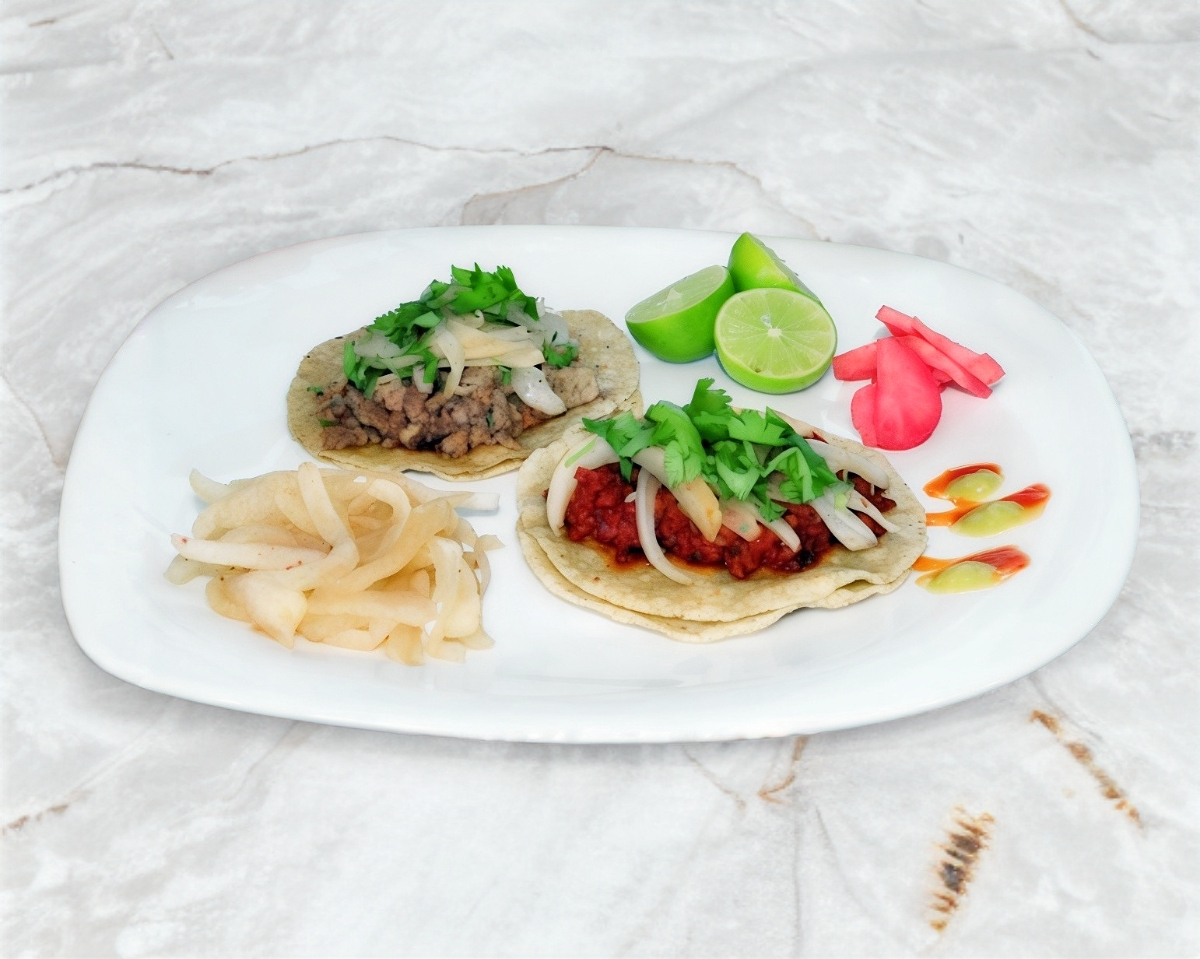 1 Tortilla de maíz o tortilla de harina doblada con su ración de carne sobre queso fundido.