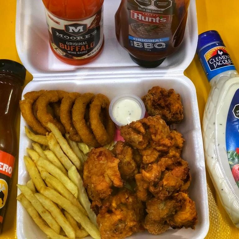 Boneless (500 g Aprox.) bañados en salsa Mango Habanero + Aderezo ranch + Papas a la francesa sazonadas en lemon pepper