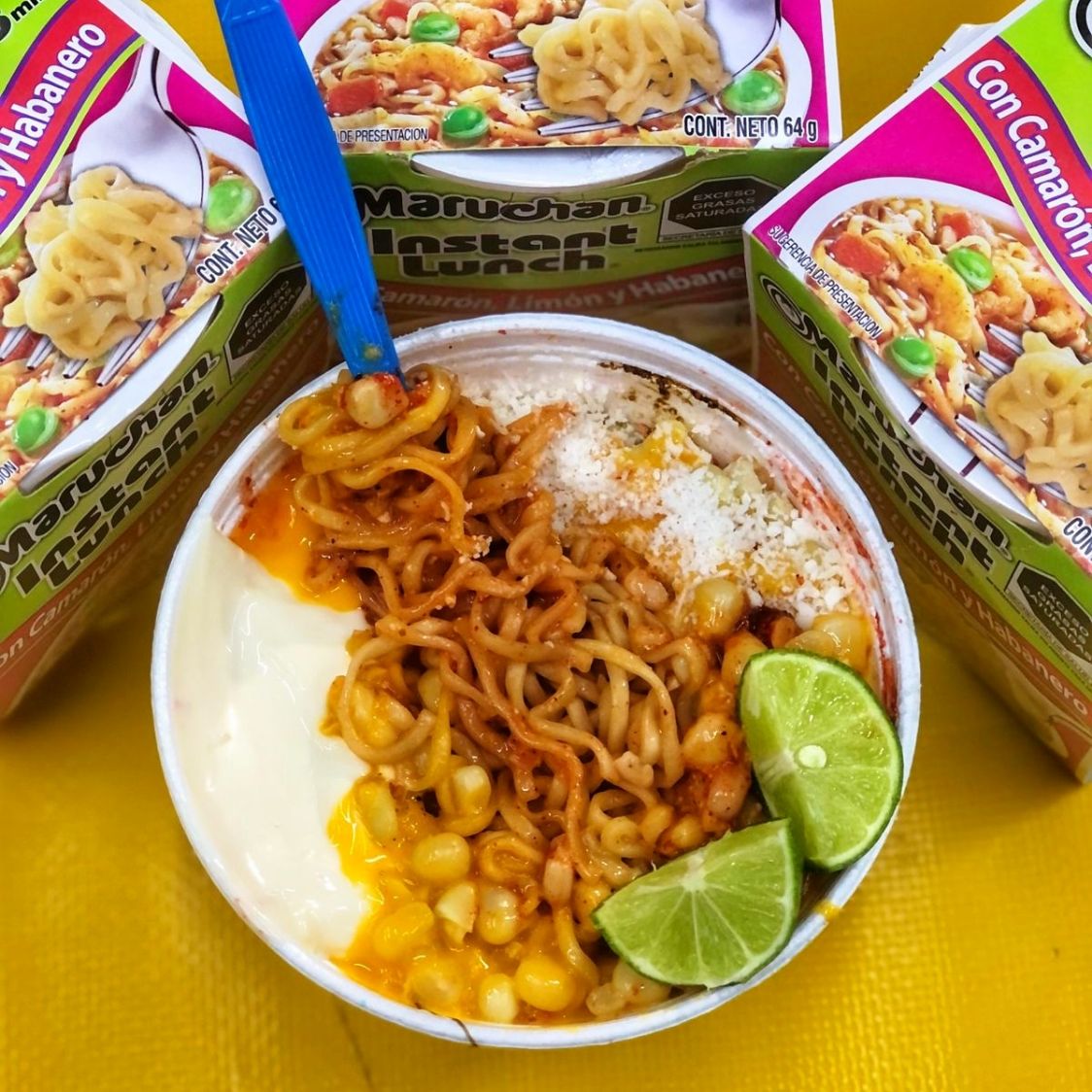Maruchan en vaso de medio litro + Elote + Mayonesa (Mc Cormick) + Queso Amarillo + Queso Blanco (Espolvoreado) + Chile preparado + Toque de limón y Maggi