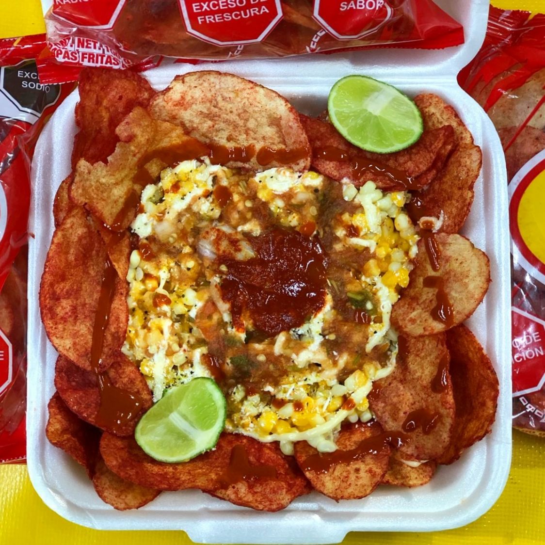 1 Takis + Vaso de medio litro que incluye elote y los aderezos de tu elección.