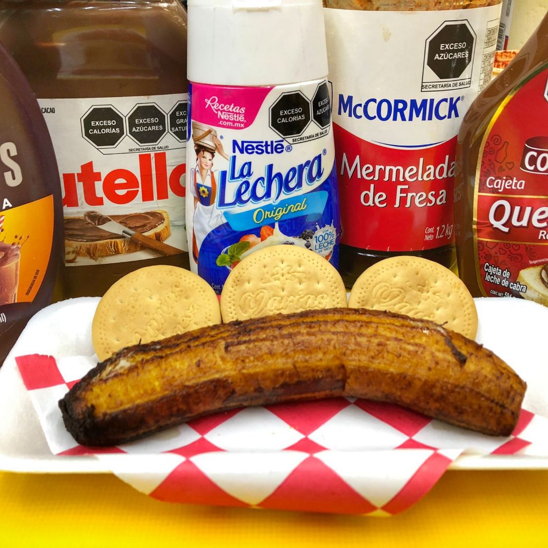 1 plátano frito sabor mermelada de fresa + porción de lechera