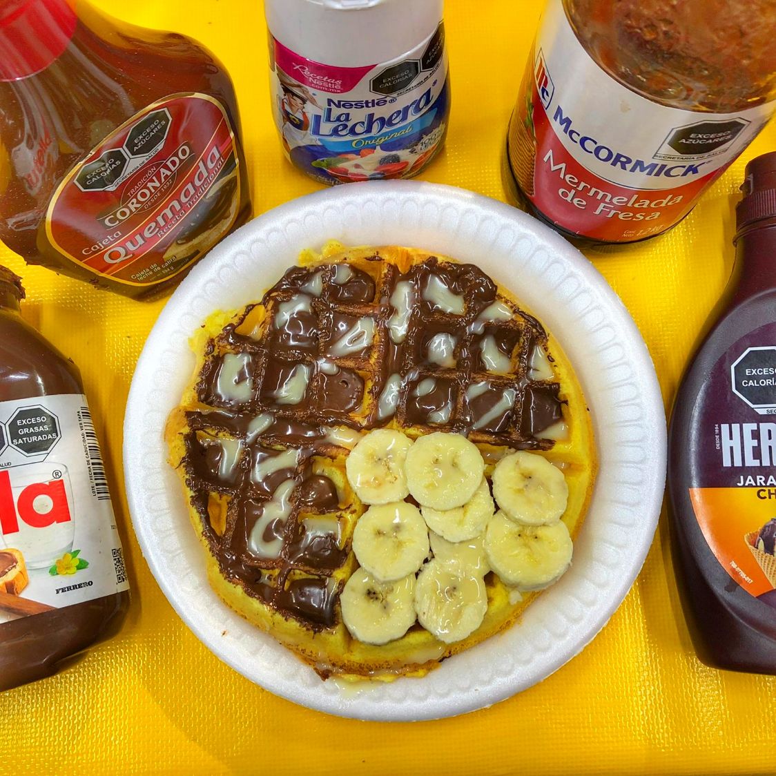 Waffle con sabor Cajeta + Porción de lechera + Topping de fruta