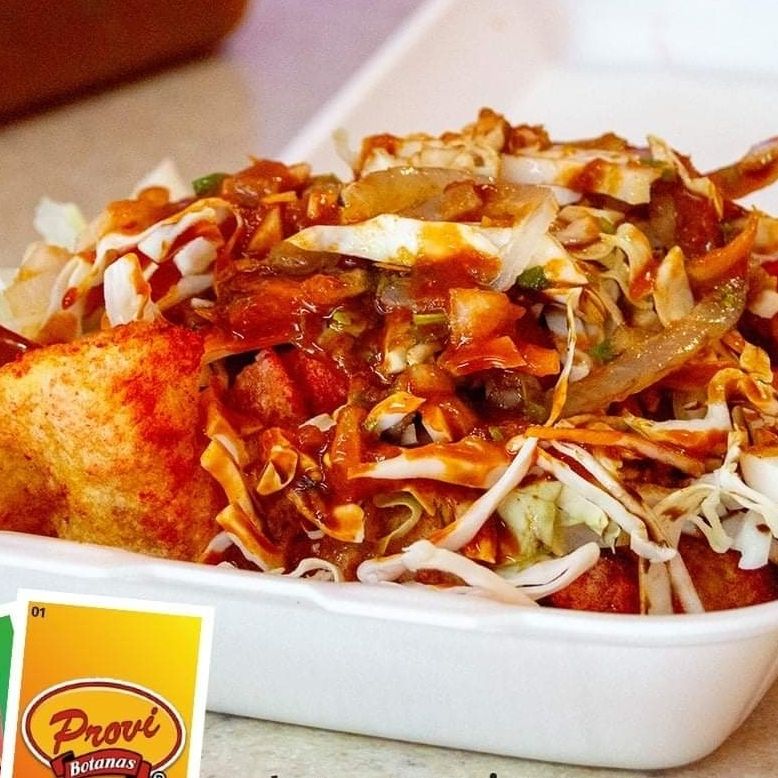 Botana tradicional potosina incluye: Papa adobada + Repollo + Cilantro + Cebolla + Jitomate + Crema (LALA) + Salsa casera + Salsa Valentina + Toque de limón + Queso Blanco (Espolvoreado)