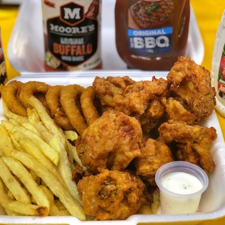 Boneless (500 g Aprox.) bañados en salsa BBQ + Aderezo ranch + Papas a la francesa sazonadas en lemon pepper