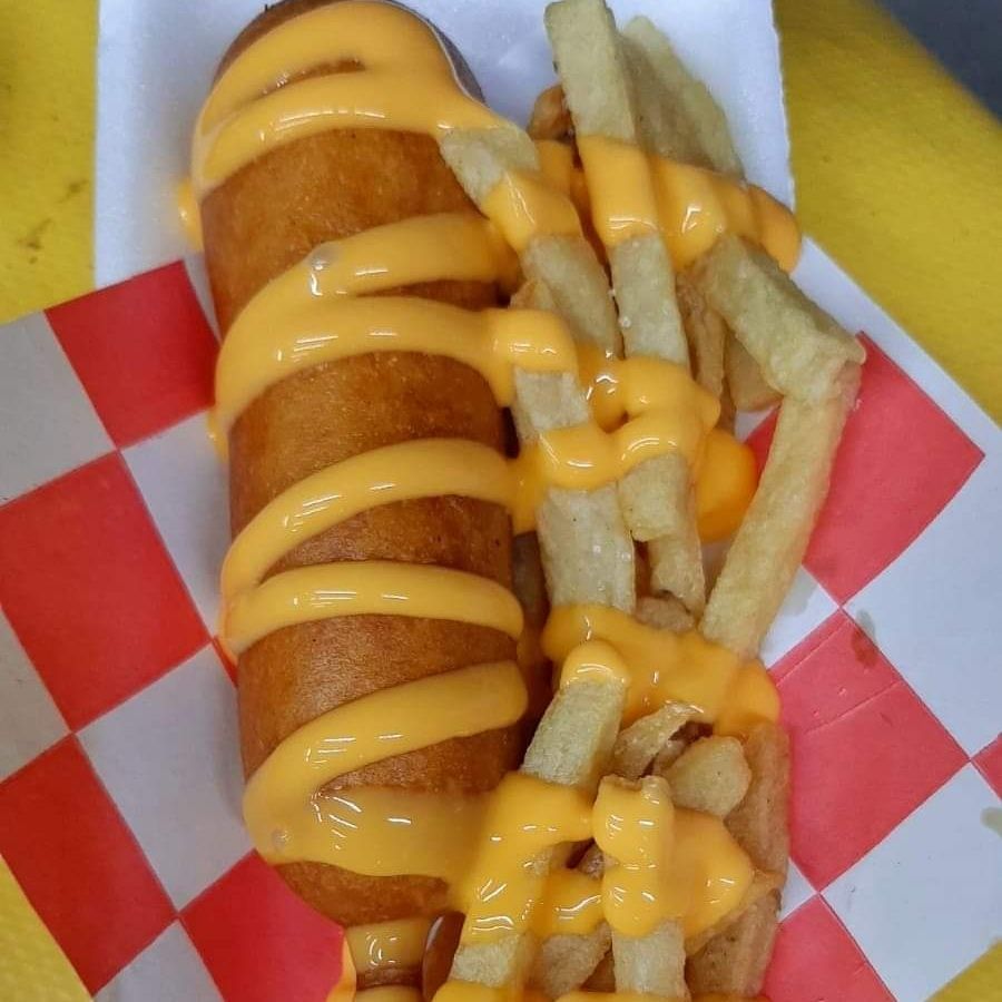 1 Banderilla + Papas a la francesa sazonadas de Lemon Pepper + Queso Amarillo + Toque de Queso Parmesano