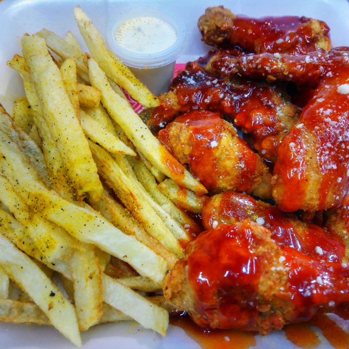 7 Alitas empanizadas y bañadas en salsa BBQ + Aderezo ranch + Papas a la francesa sazonadas en lemon pepper.