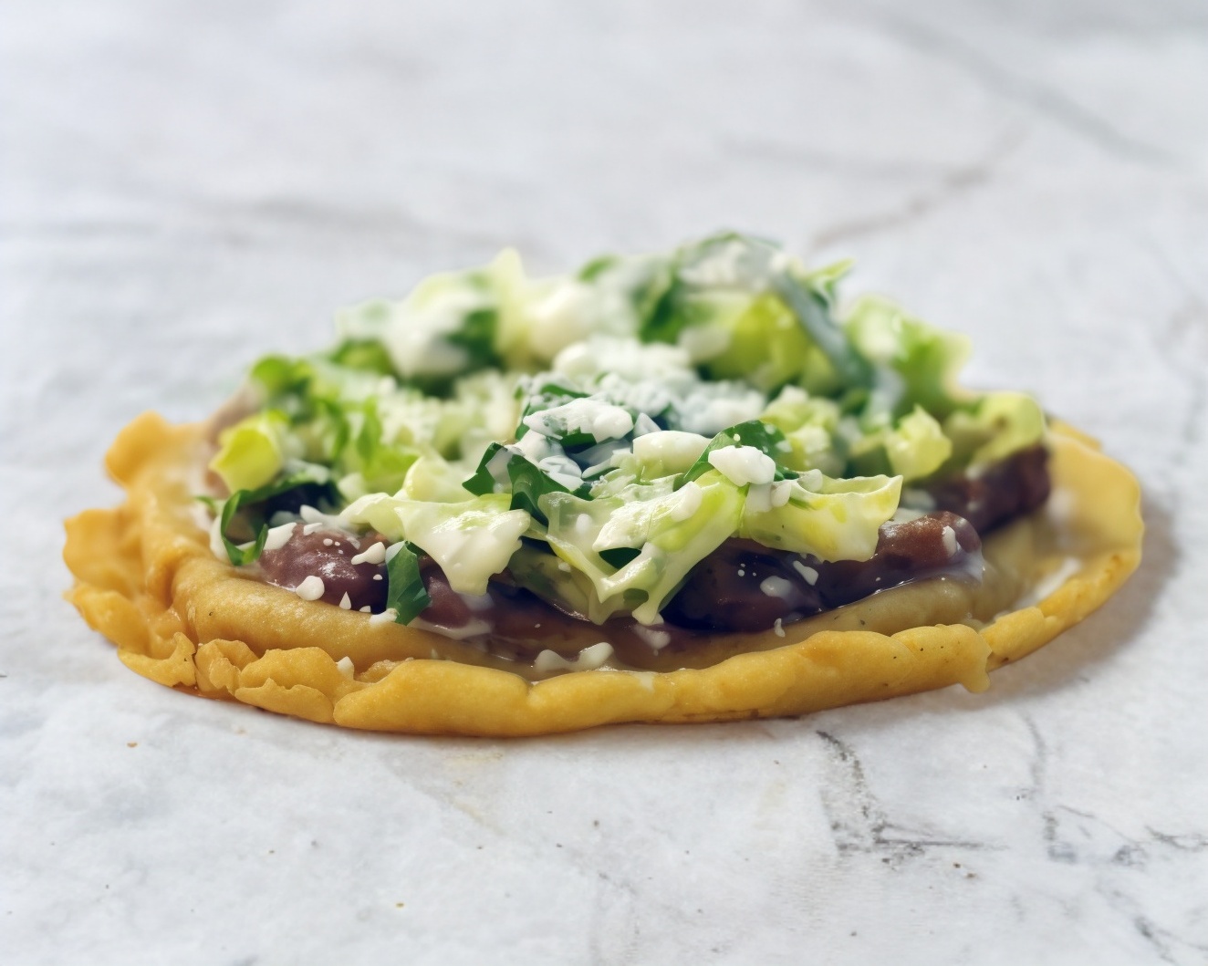 Base de maíz con frijoles, cebolla, crema, queso, cilantro.