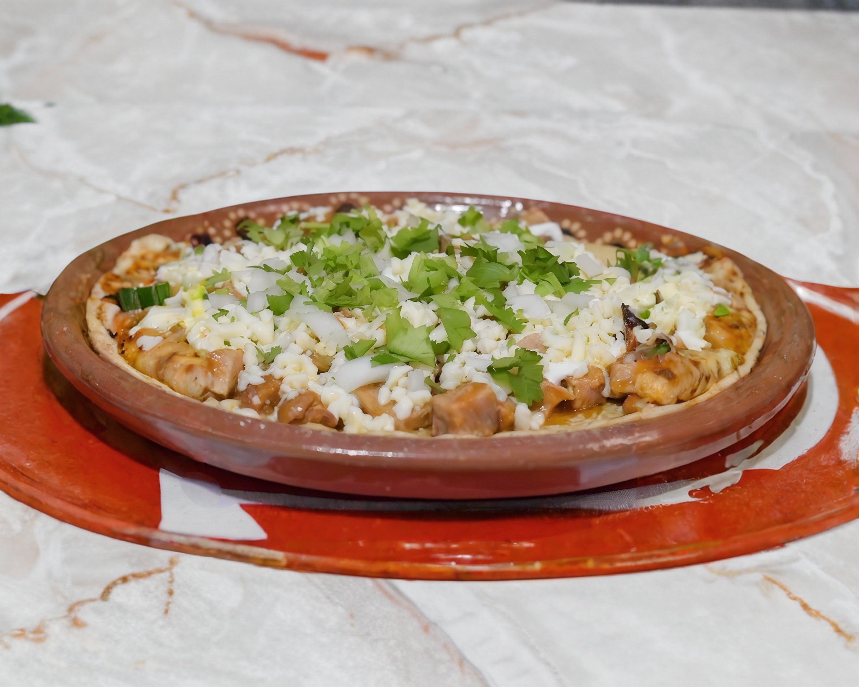 Base de maíz, cebolla, crema, queso, cilantro y guisado a elegir.