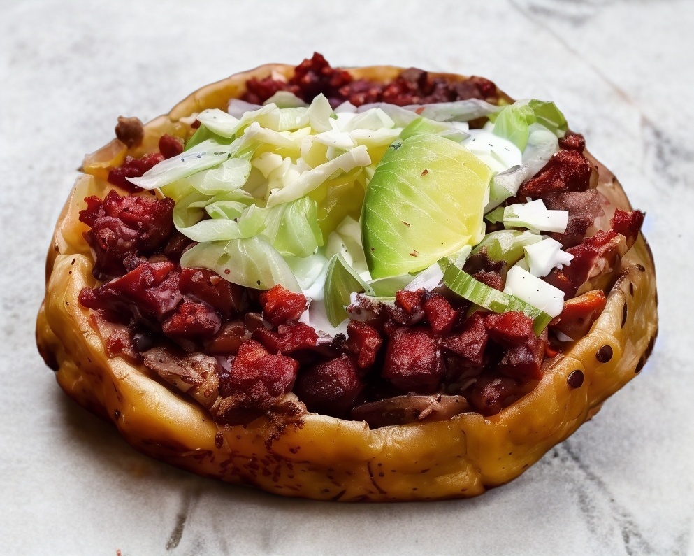 Sope gigante con cebolla, crema, queso, cilantro y barbacoa.