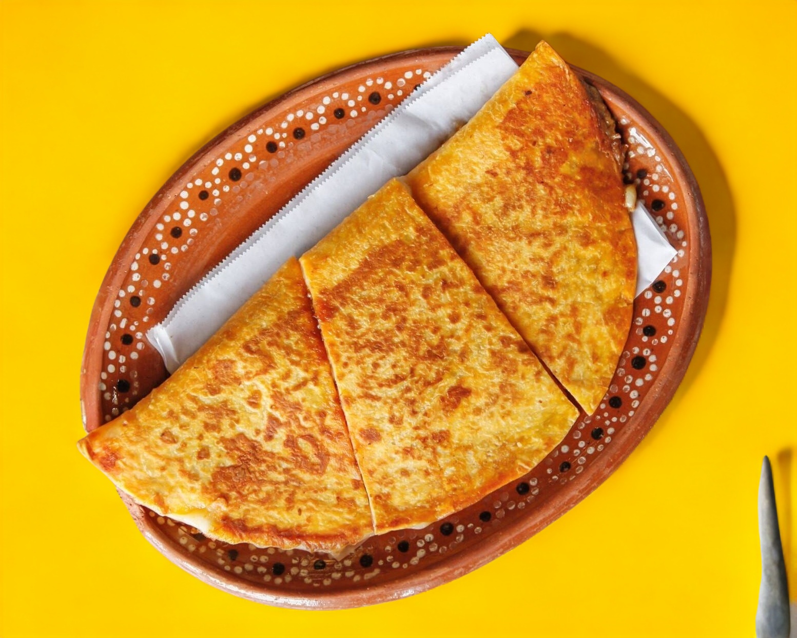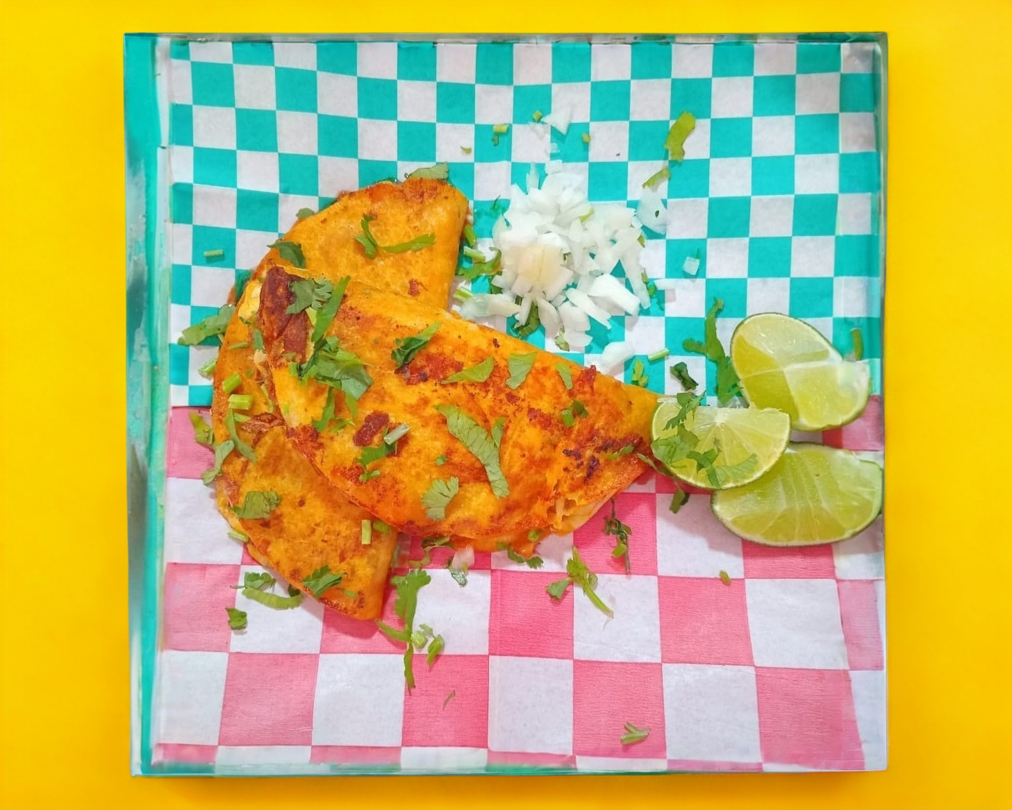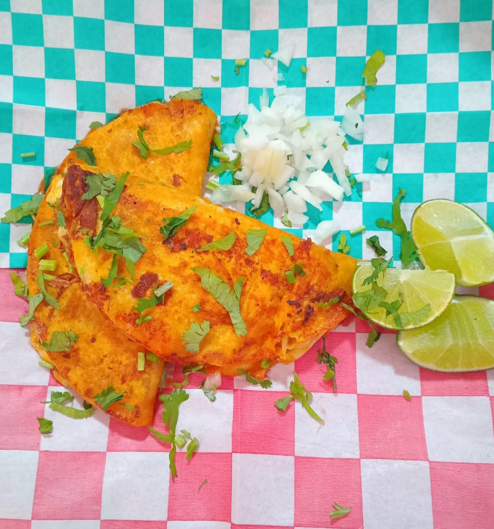 Quesabirria de maíz personal ( 130 gramos aprox) doble tortilla de maíz ,queso asadero , carne de birria ( 20 a 25 gr)cebolla ,limón ,cilantro aparte