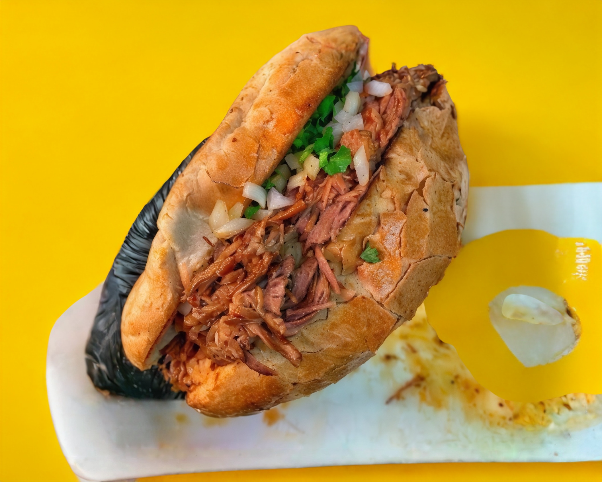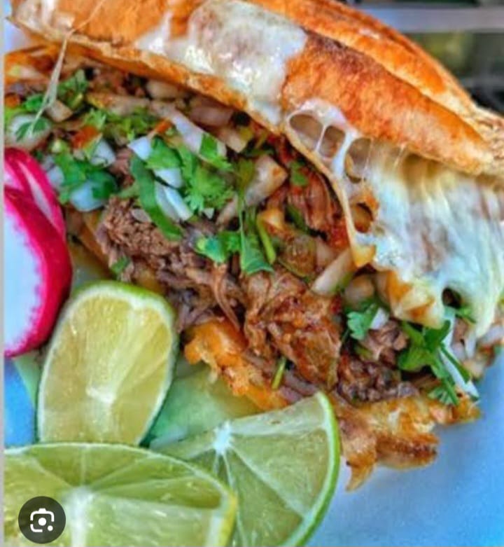 Torta Mediana personal, con Queso, bolillo con costra de queso, asadero, 50 gr carne de barbacoa,cebolla,cilantro y limón aparte.