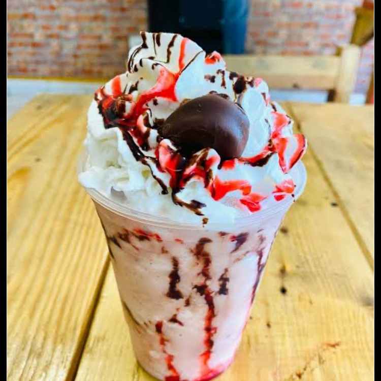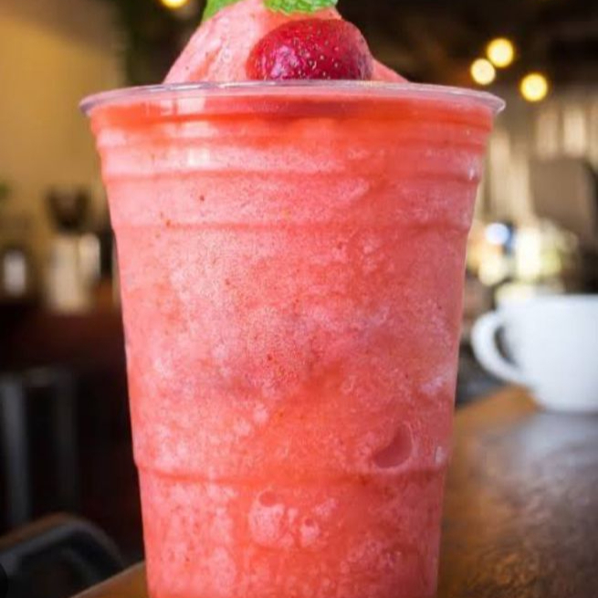 Frappe con fresa natural, crema batida y chispas de chocolate blanco.