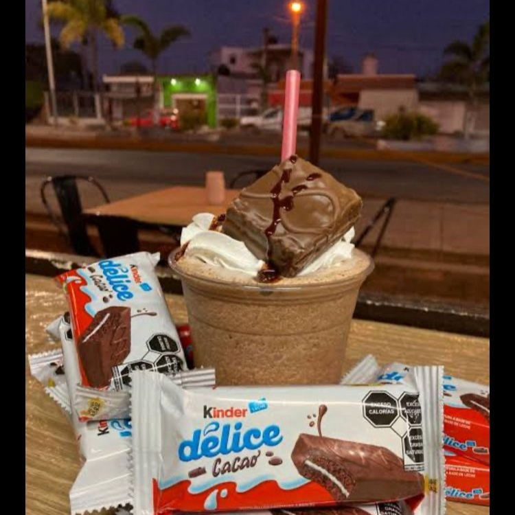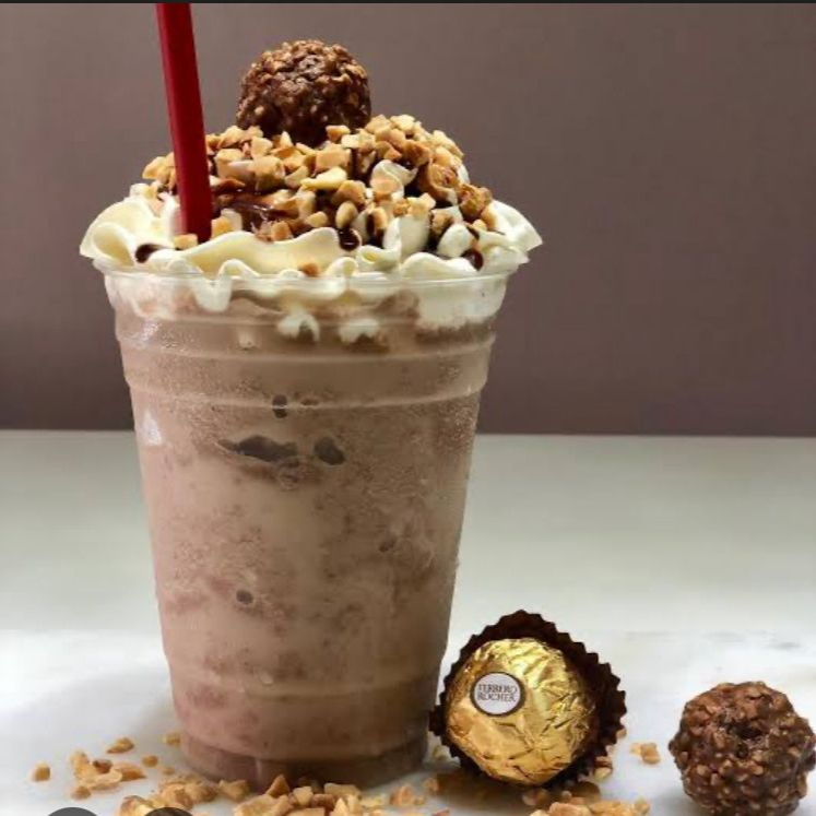 Bebida a base de hielos triturados, nutella, avellanas, concentrado de avellanasç, leche y decorado con chocolate ferrero