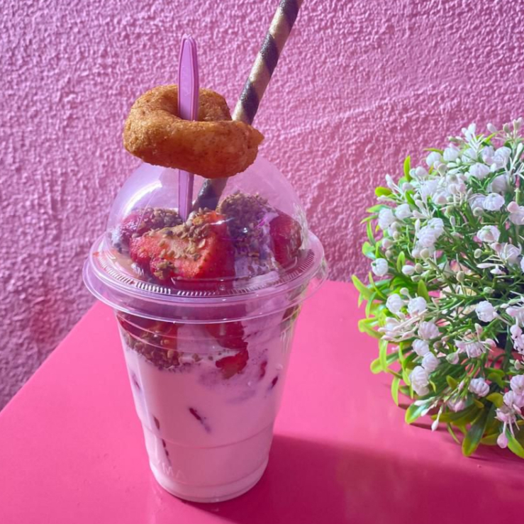 Fresa/uva, crema especial preparada, 2 toppings, 2 untable a elegir, 1 donita de azucar y un barquillo de chocolate.