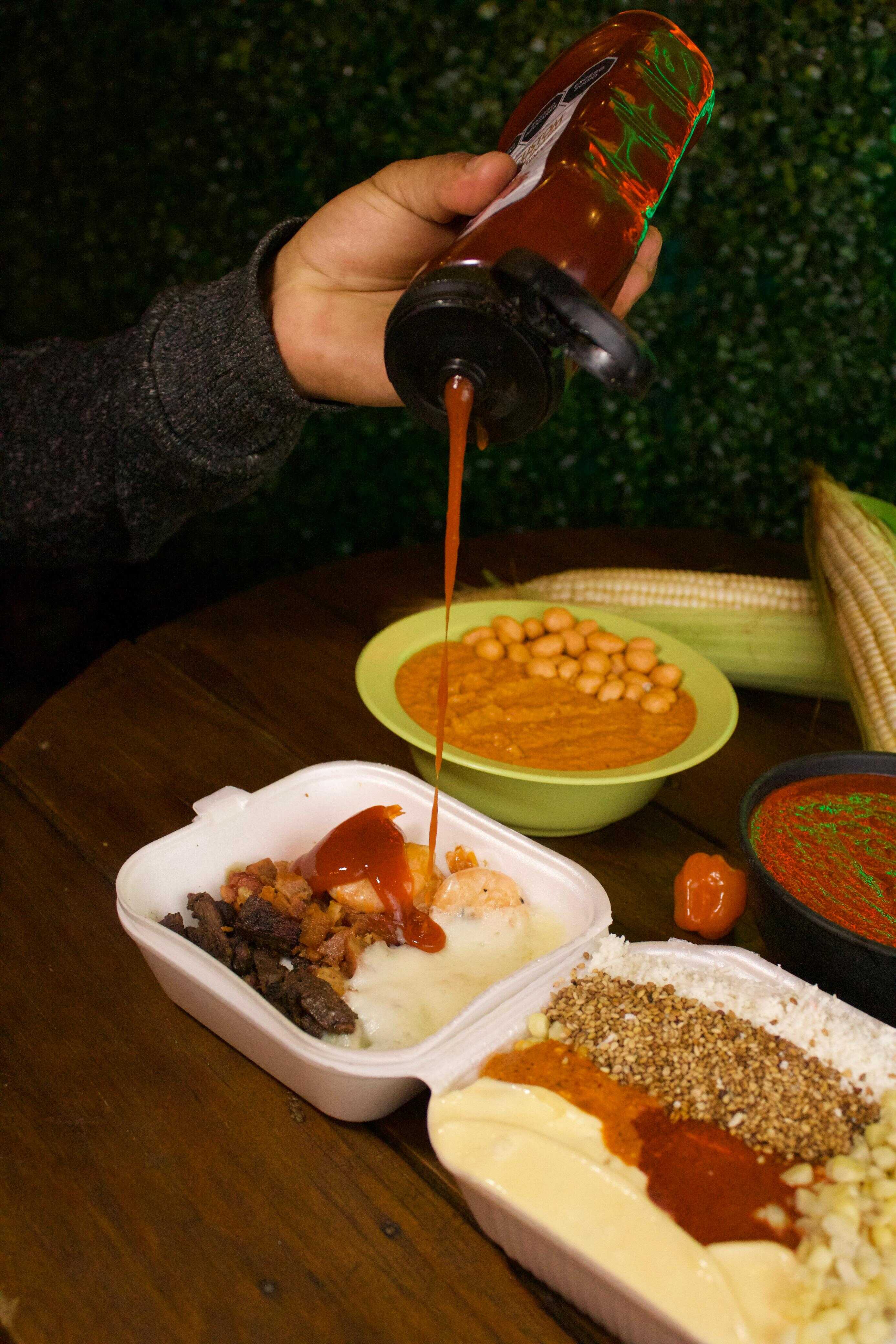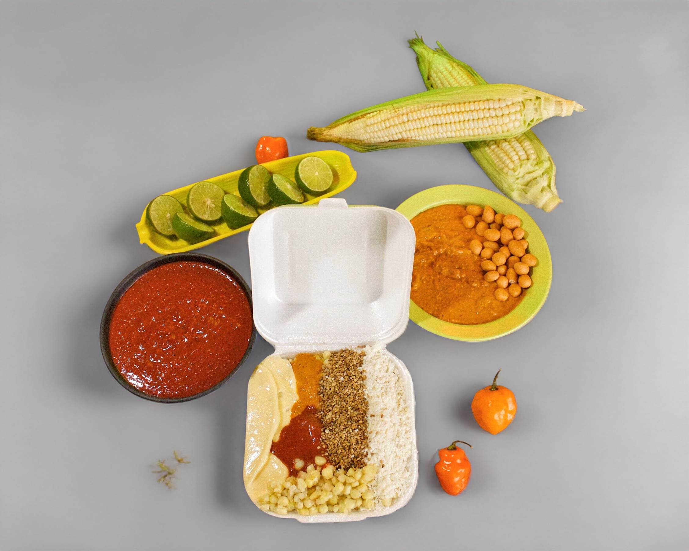 Sabrita de sabor preparada con doble cucharón de elote desgranado con ingredientes y aderezos.