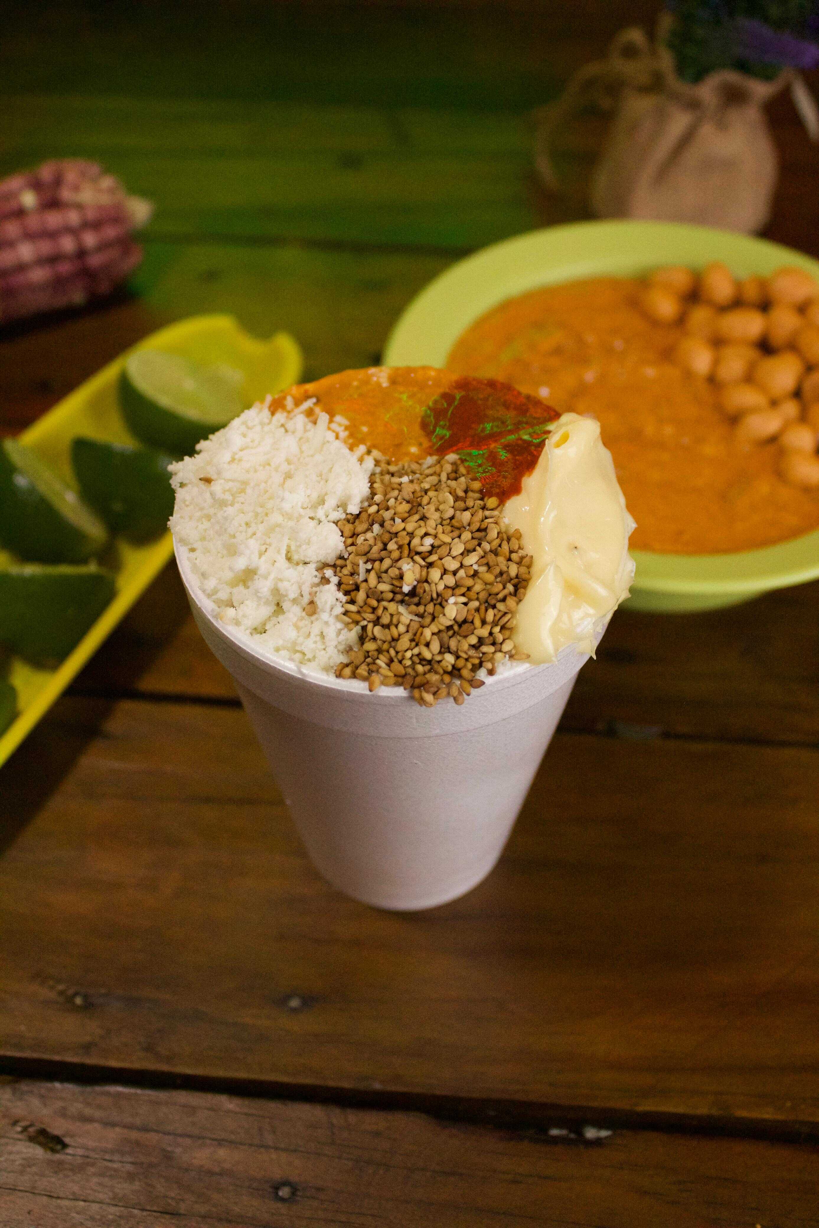 La versión sencilla del sabrielote, tachitos con elote desgranado y aderezos.