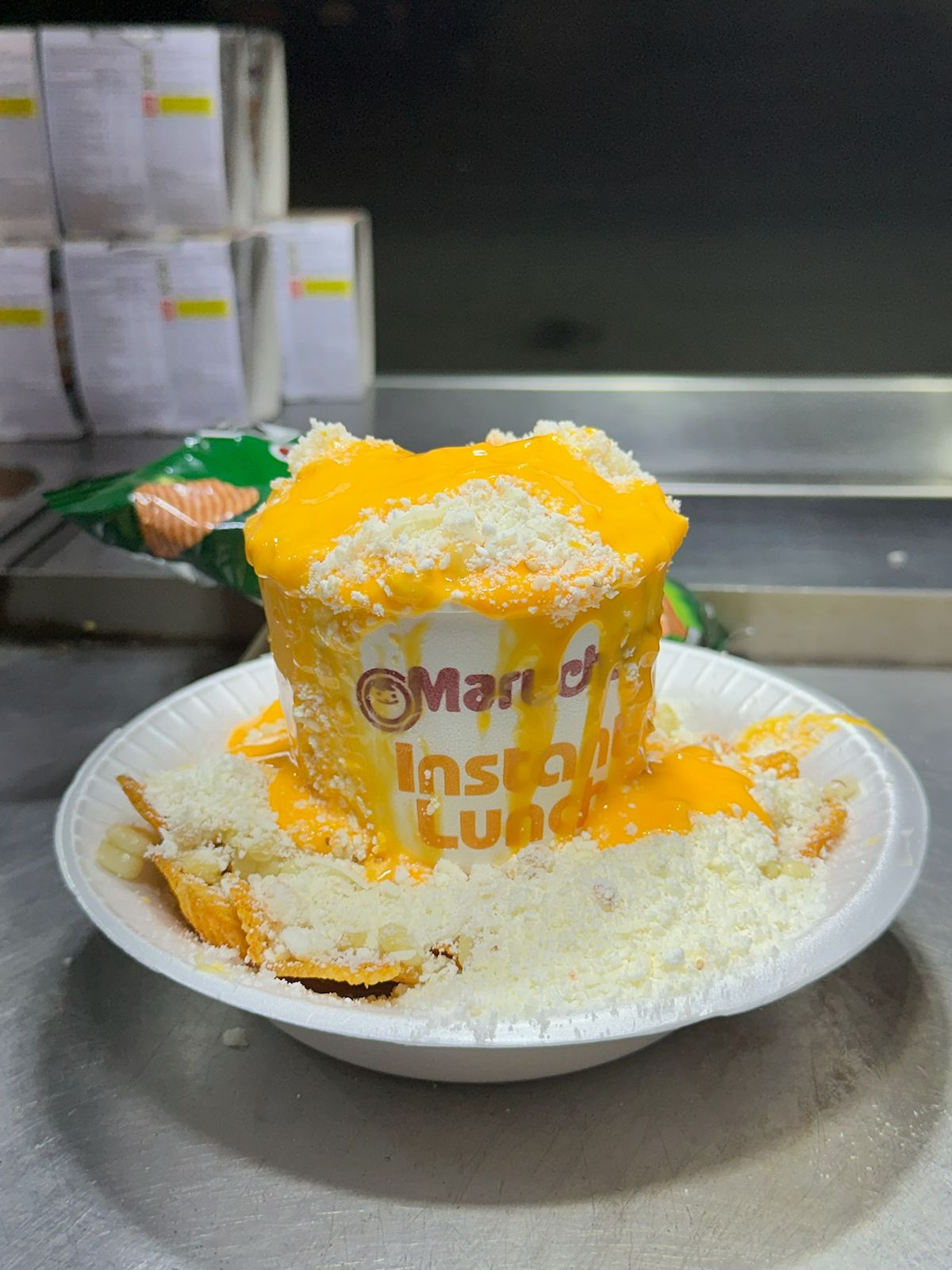 Maruchan con elote desgranado chorreado de queso y topping.