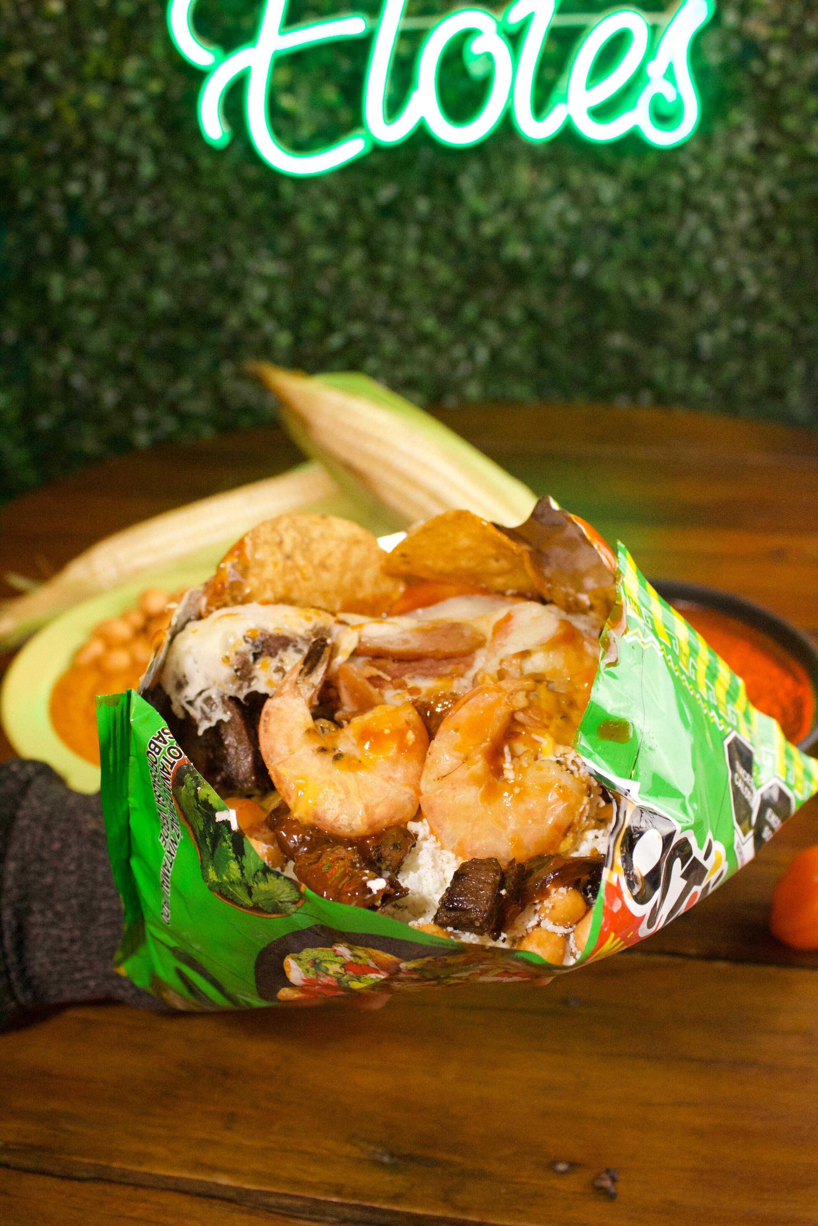 Mezcla de carnes, quesos, elote natural y sabritas.