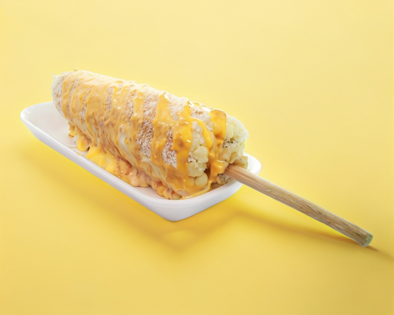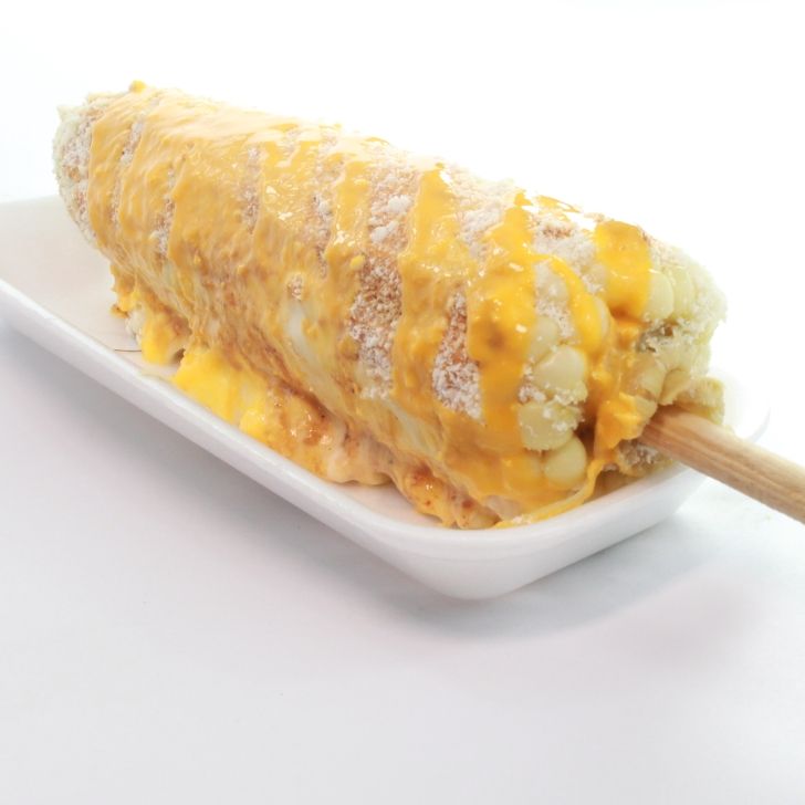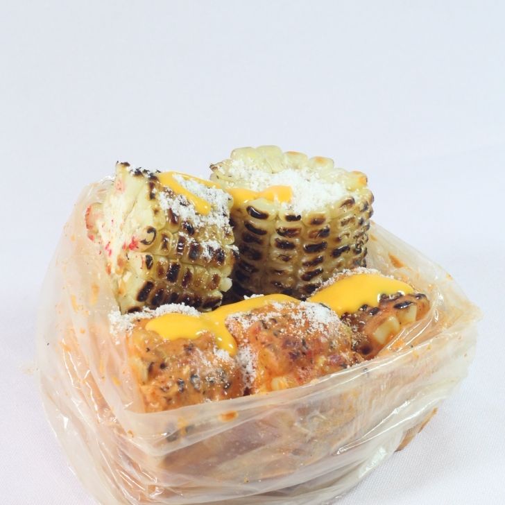 Elote partido en rodajas con crema,mayonesa,queso blanco y limon