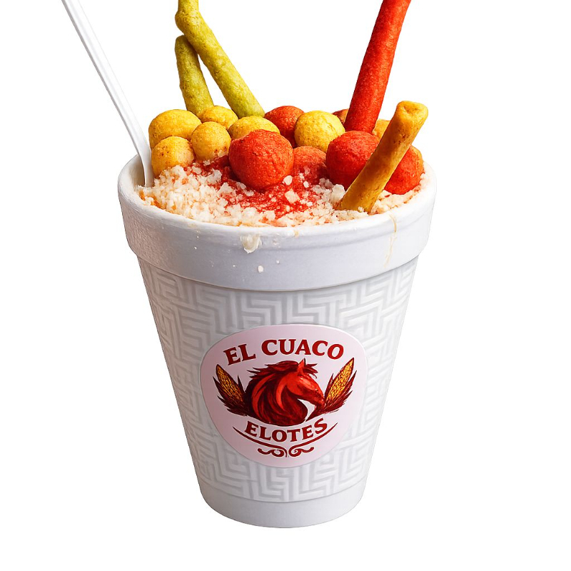 Esquite en vaso de 8 oz crema, mayonesa, queso blanco, chile en polvo y 3 toppings