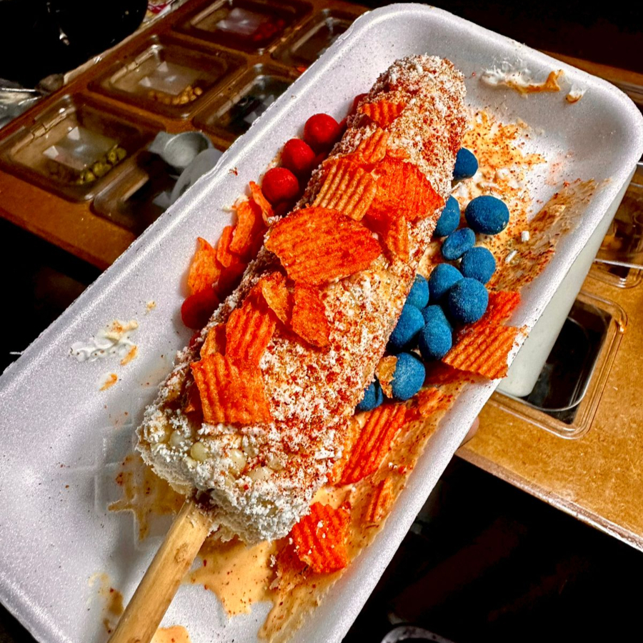 Elote entero empanizado con chetos flaming hot bañado en queso amarillo con 3 top´pings a eleccion