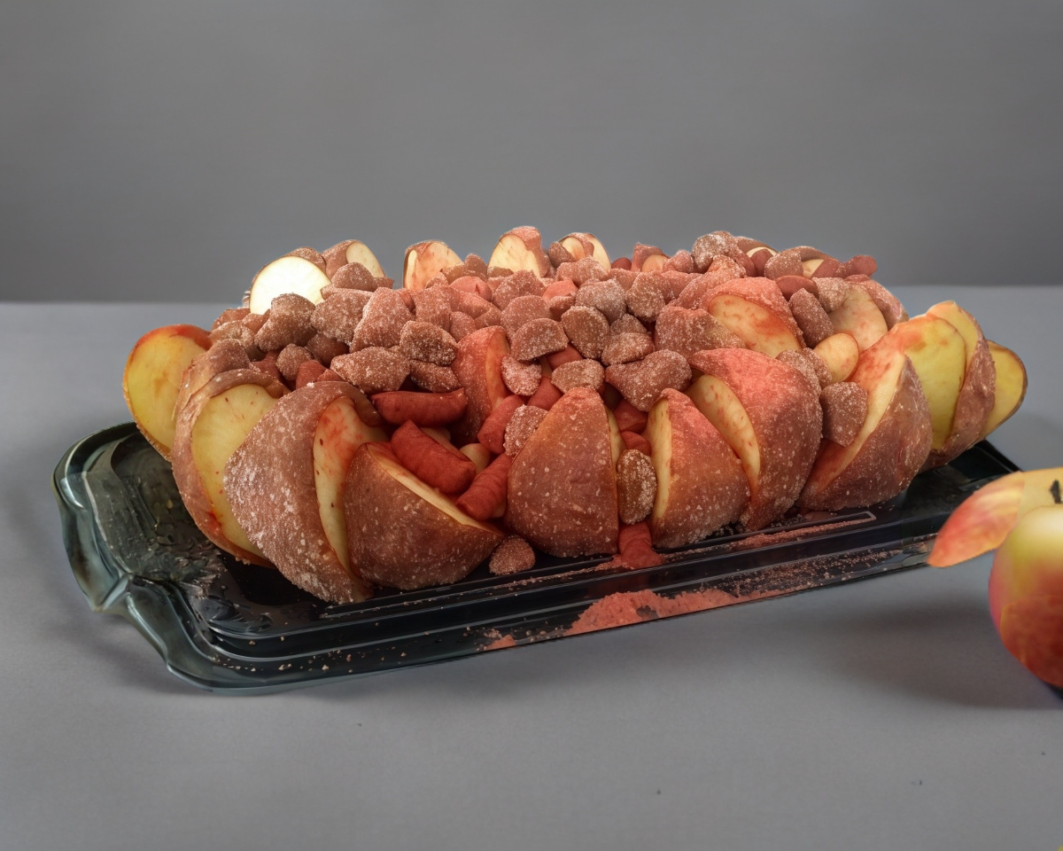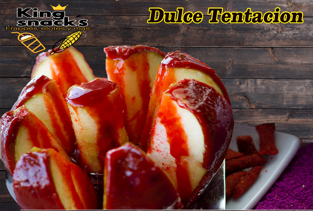 4 manzanas cubiertas de tamarindo cortadas en rebanadas con topping: cacahuate japonés, dos tipos de tamarindo dulce y picoso, dos tipos de chamoy artesanal y chamoy normal, polvo miguelito y salsa valentina. Picante.