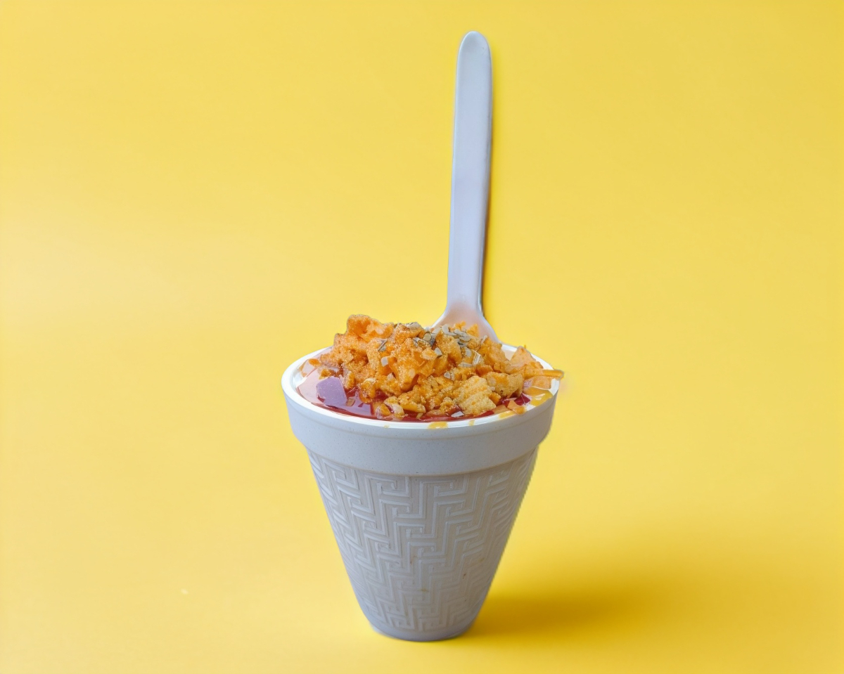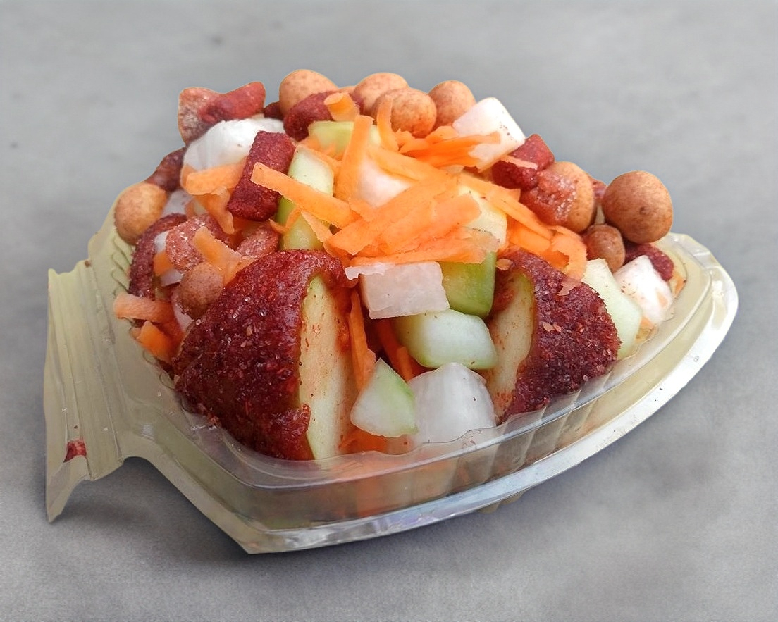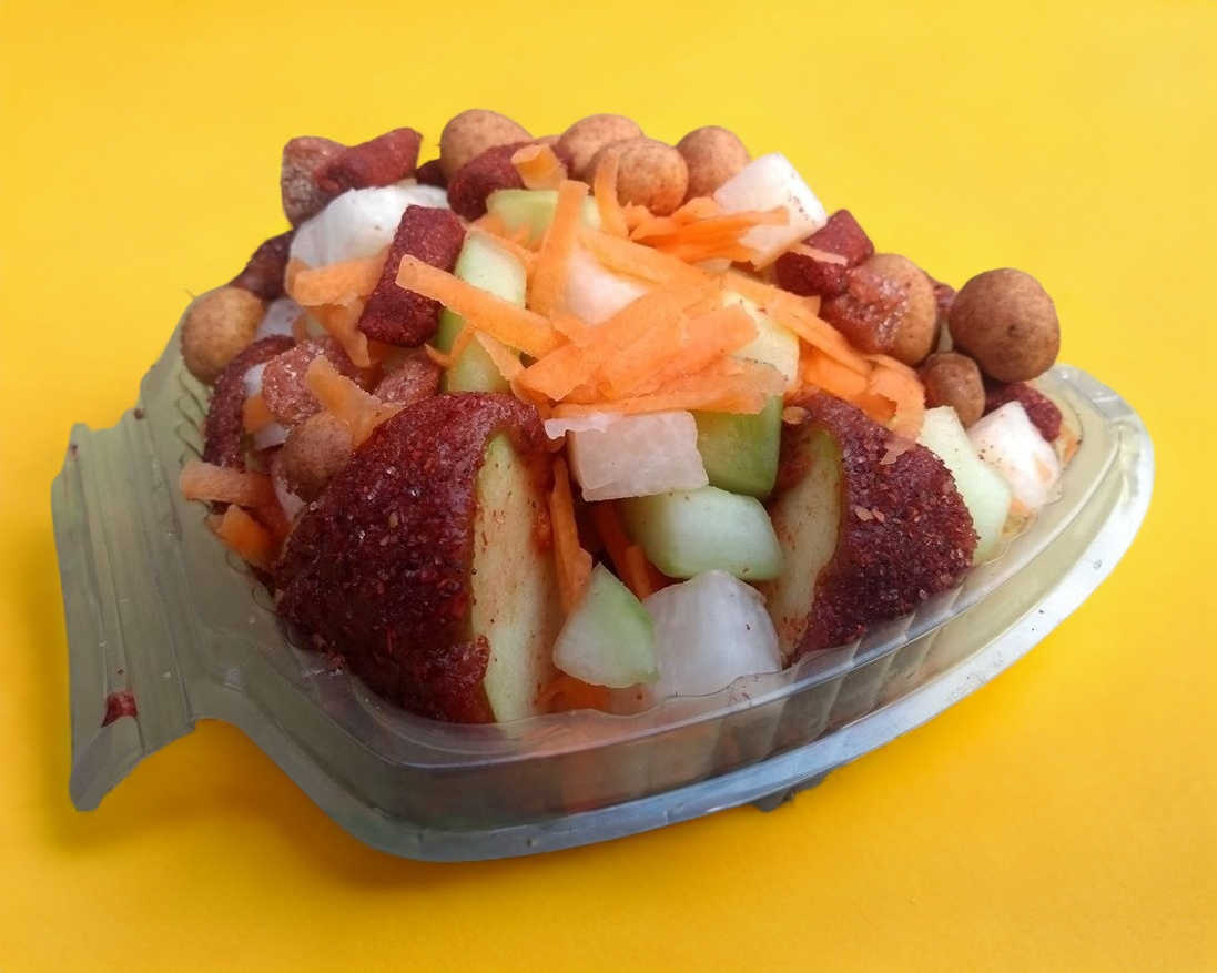 Con jicama, zanahoria, pepino, cortado en cuadros y rallada con topping: cacahuete japonés, dos tipos de tamarindo dulce y picoso, dos tipos de chamoy artesanal y chamoy normal, polvo miguelito y salsa valentina. Picante.