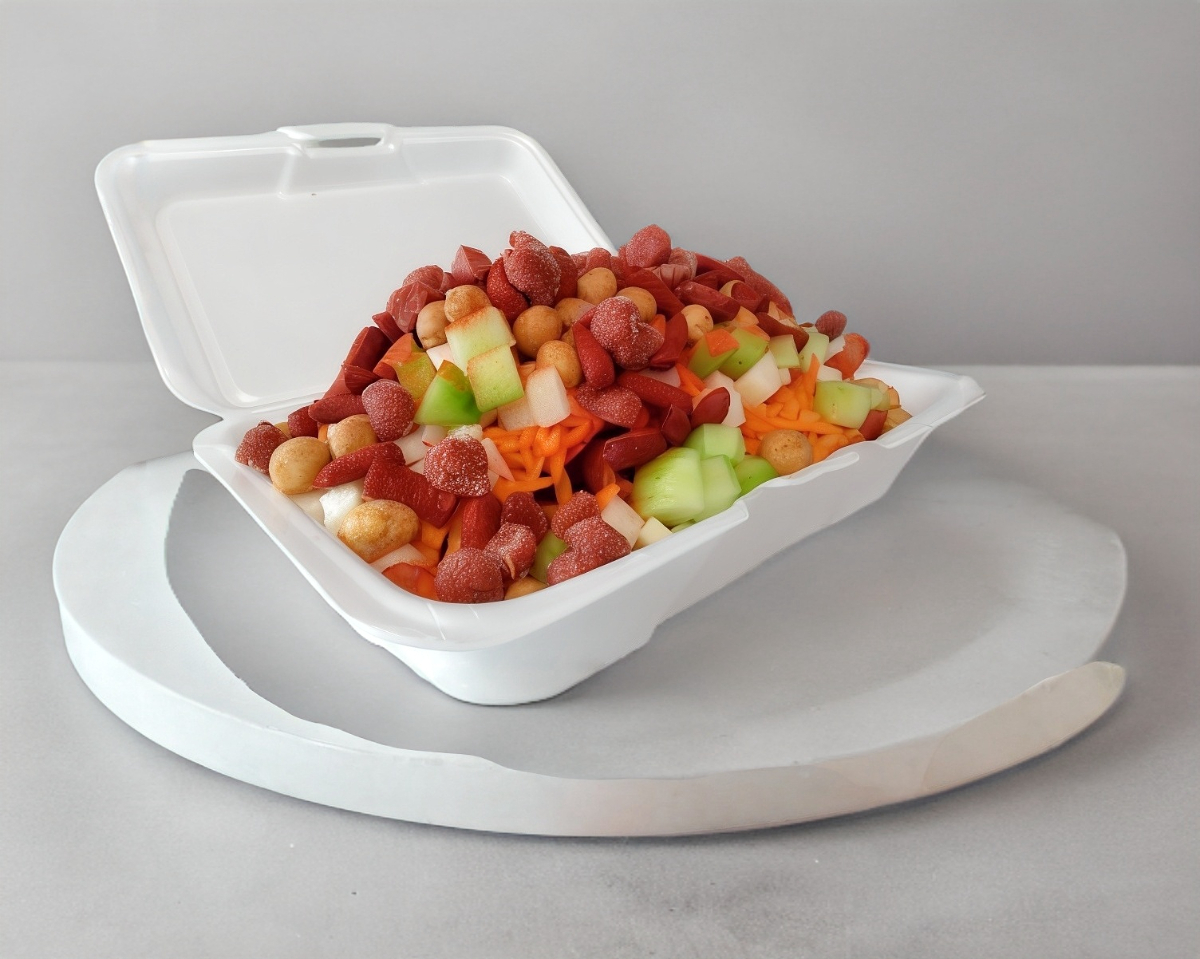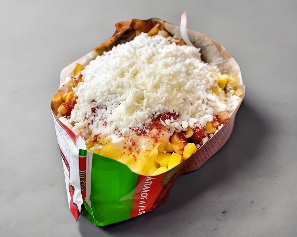 Con Jicama, Zanahoria 120 gr, Pepino 80 gr cortado en cuadros y rallada, Topping cacahuete japonés 100 gr, Dos tipos de tamarindo: Dulce (50 gr) y Picoso (80 gr), Dos tipos de chamoy artesanal y Chamoy normal, Polvo miguelito y Salsa valentina Picante.
