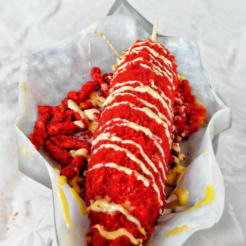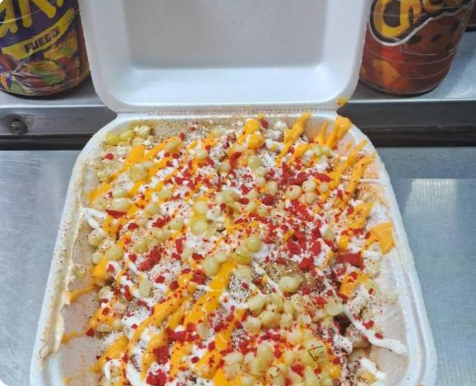 Pieza de elote bañada en mayonesa, salsa de la casa, queso fresco, limón, sal, crema, queso amarillo y el ingrediente secreto, empanizada con Takis.