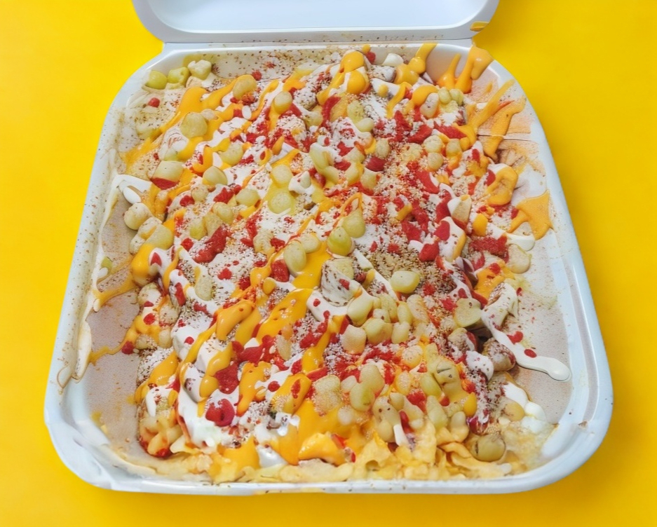 Dentro de una charola va unas conchitas provi, bañadas en mayonesa, salsa de la casa, elote, queso fresco, limón, sal, crema, queso amarillo y el ingrediente secreto.