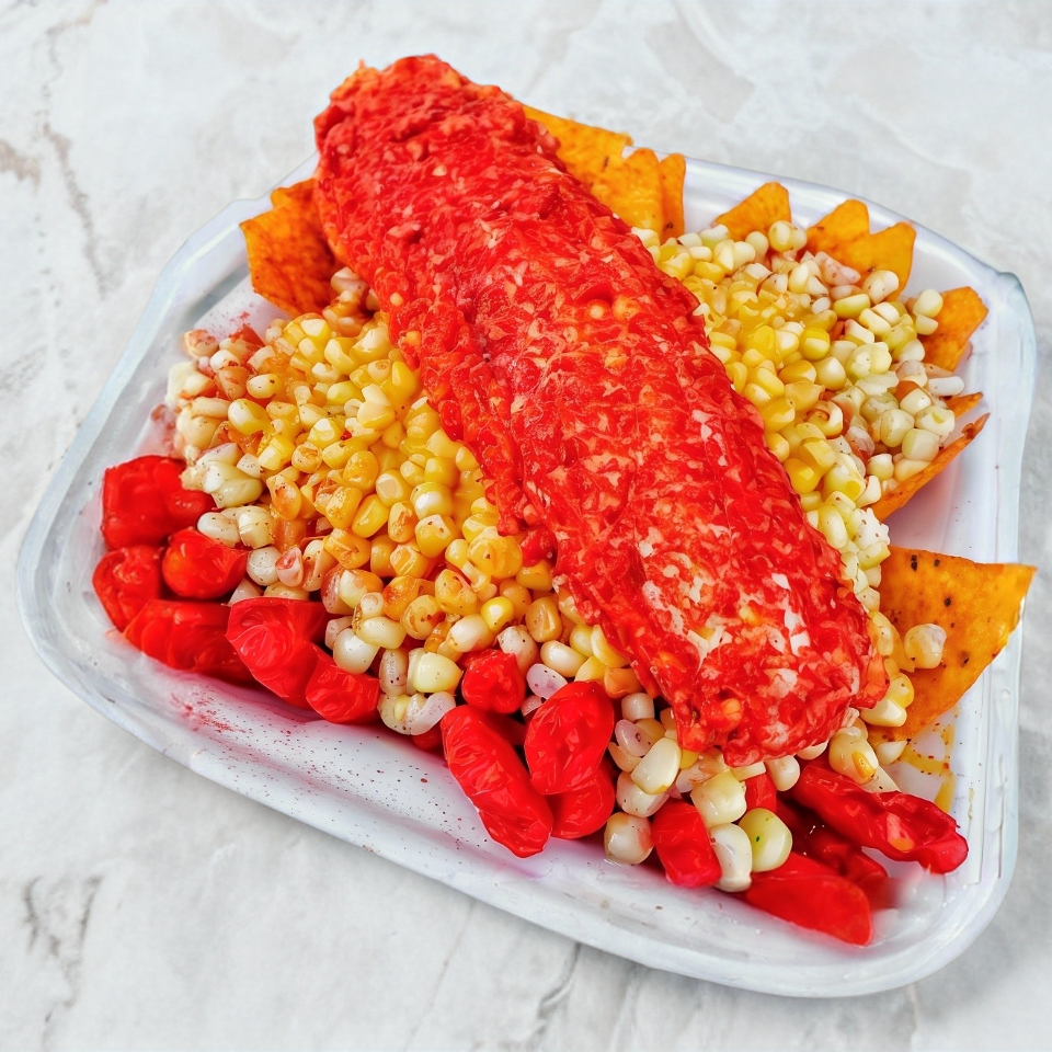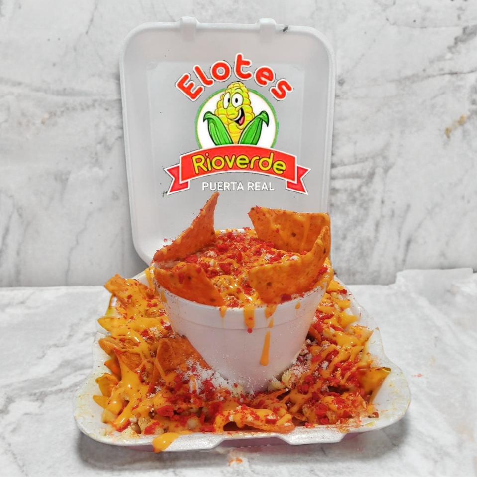 Pieza de elote empanizada con Cheetos flamin en una charola grande más Tostitos en los lados, bañados en mayonesa, crema, limón, sal, queso amarillo, queso fresco, más elote desgranado.