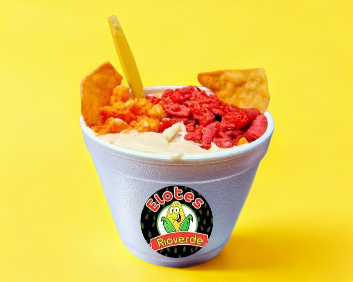 Medio lt de elote con la sabritas de tu preferencia tanto dentro como fuera.