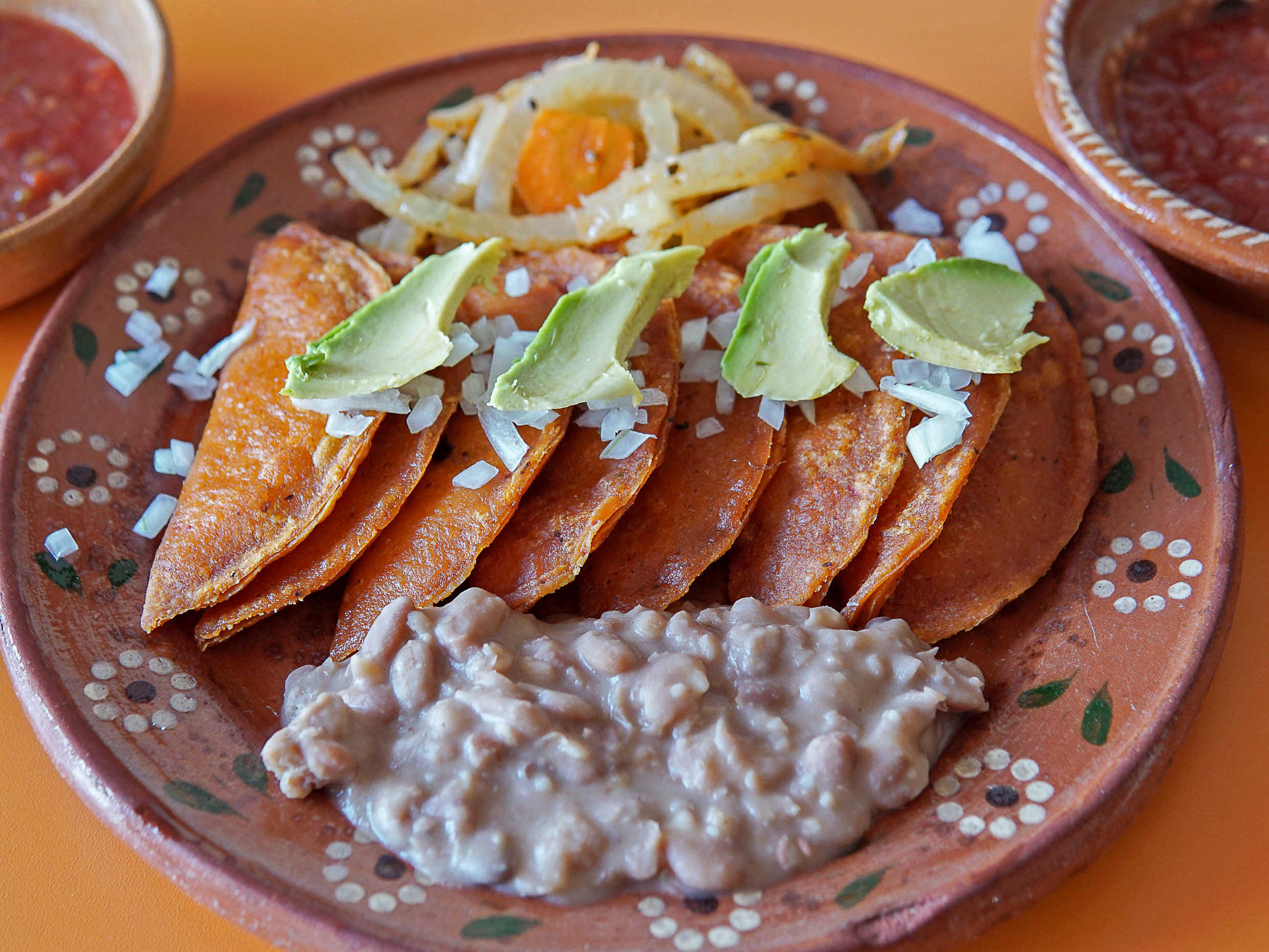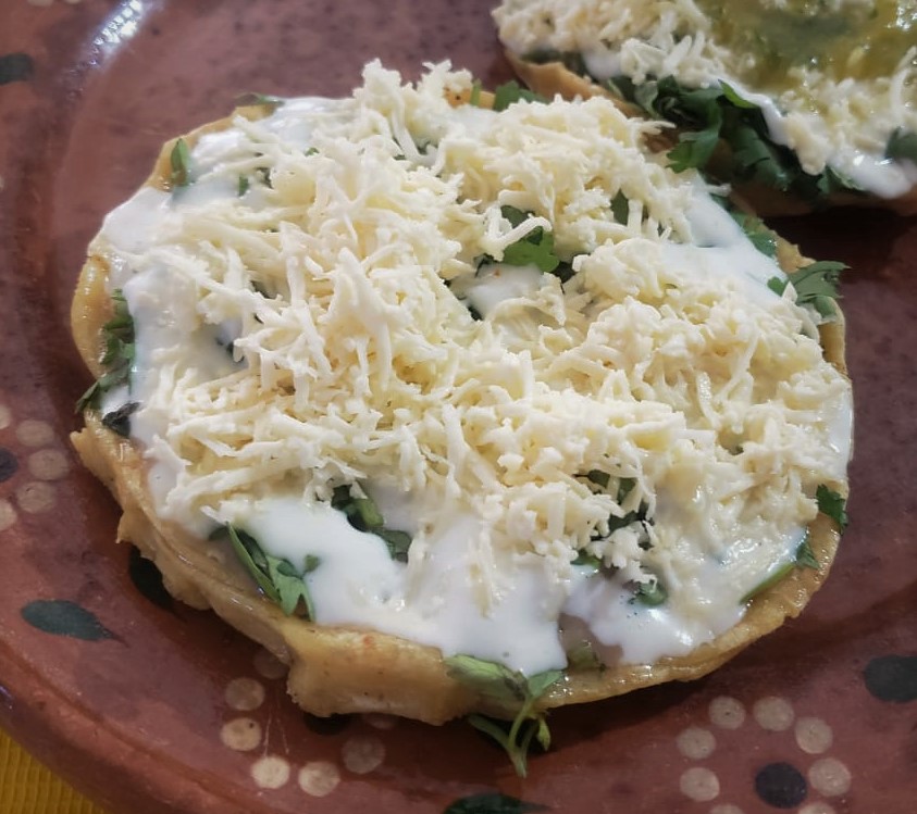 Totopo (tortilla frita) bañada en salsa con queso y crema. Acompañados de frijoles refritos.