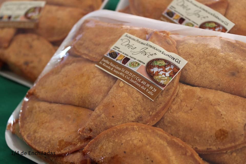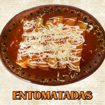 6 Tortillas rellenas de queso bañadas en caldillo de jitomate y acompañada de queso y crema.