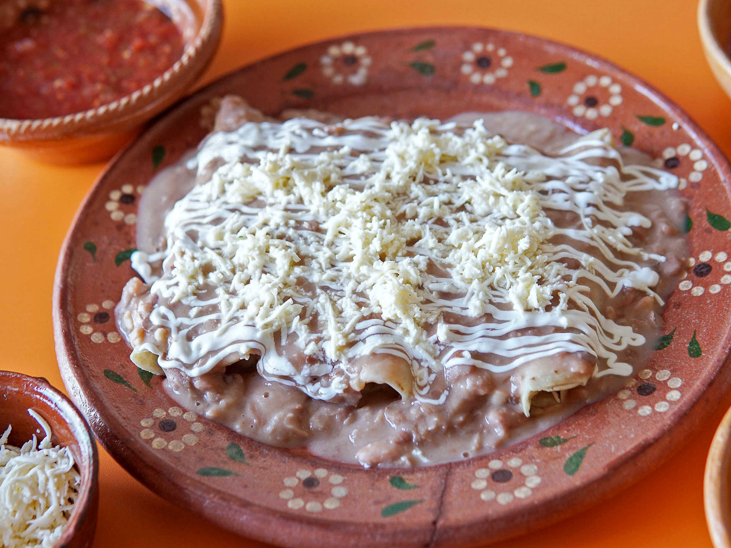 6 Tortillas rellenas de queso bañadas en frijoles fritos y acompañada de queso y crema.