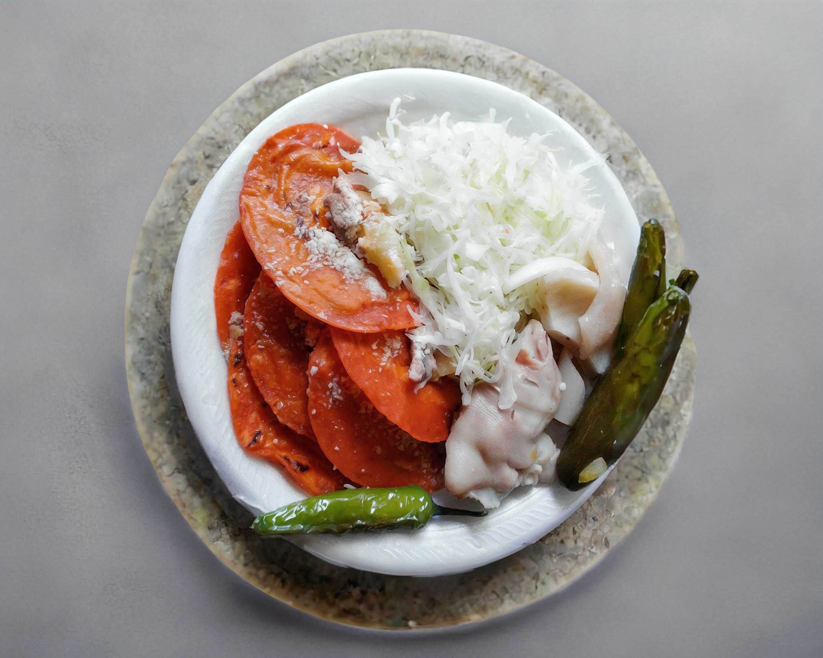 10 Enchiladas con patita en vinagre. Incluye lechuga y chiles en vinagre.